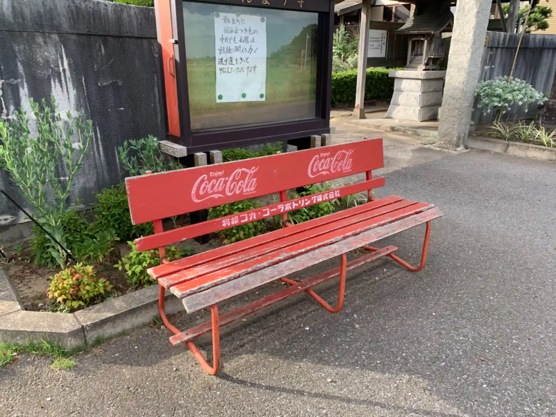 田んぼの中にあるお寺。中世に創建された古いお寺です。入り口にコカコーラのベンチがあります。