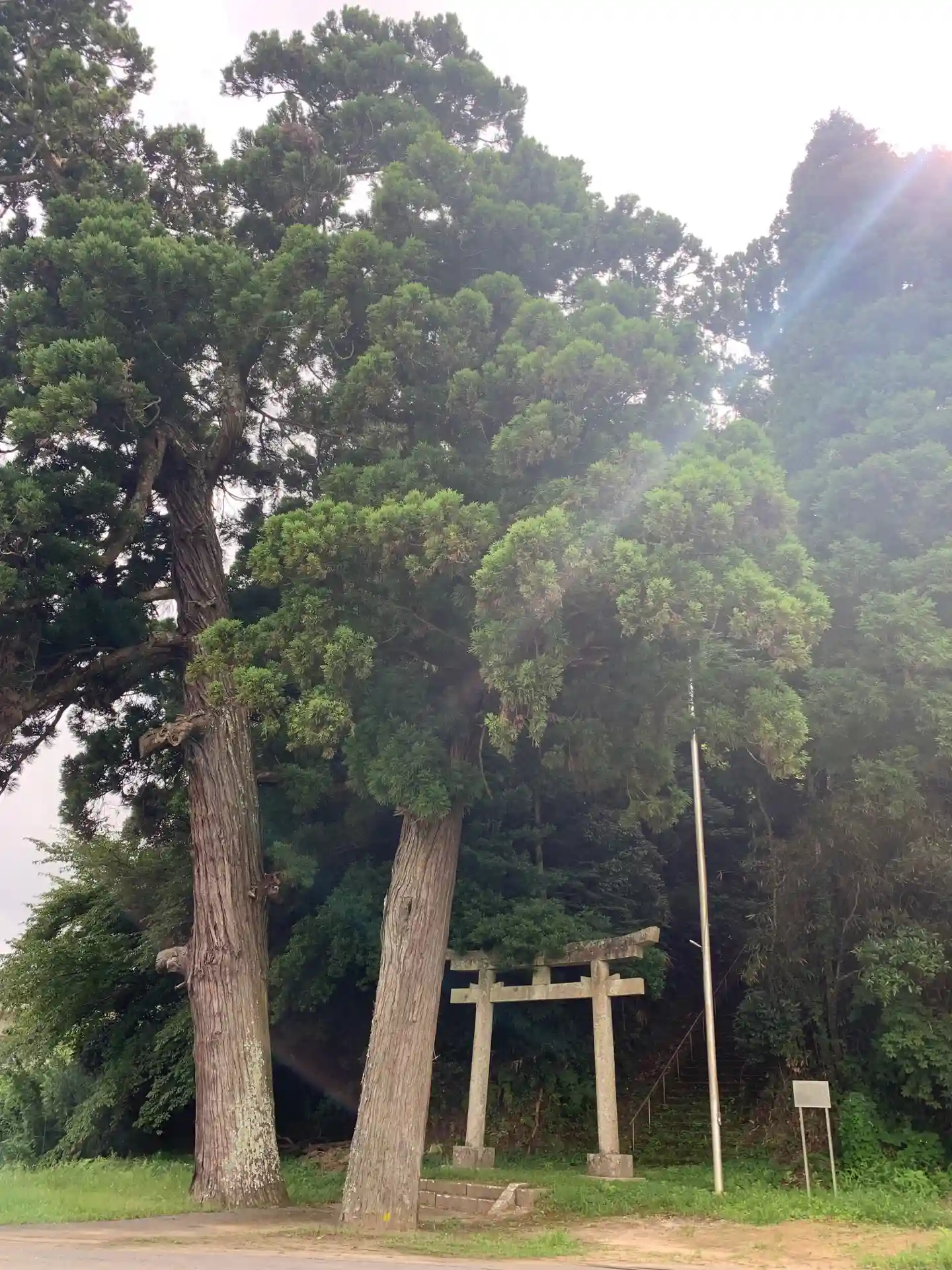 大きな夫婦杉が目印。鳥居をくぐって苔にまみれた素敵な石段を登ると広々とした境内、そして不思議な顔面の狛犬が出迎えてくれます。御宿の月夜見神社狛犬に似ています。