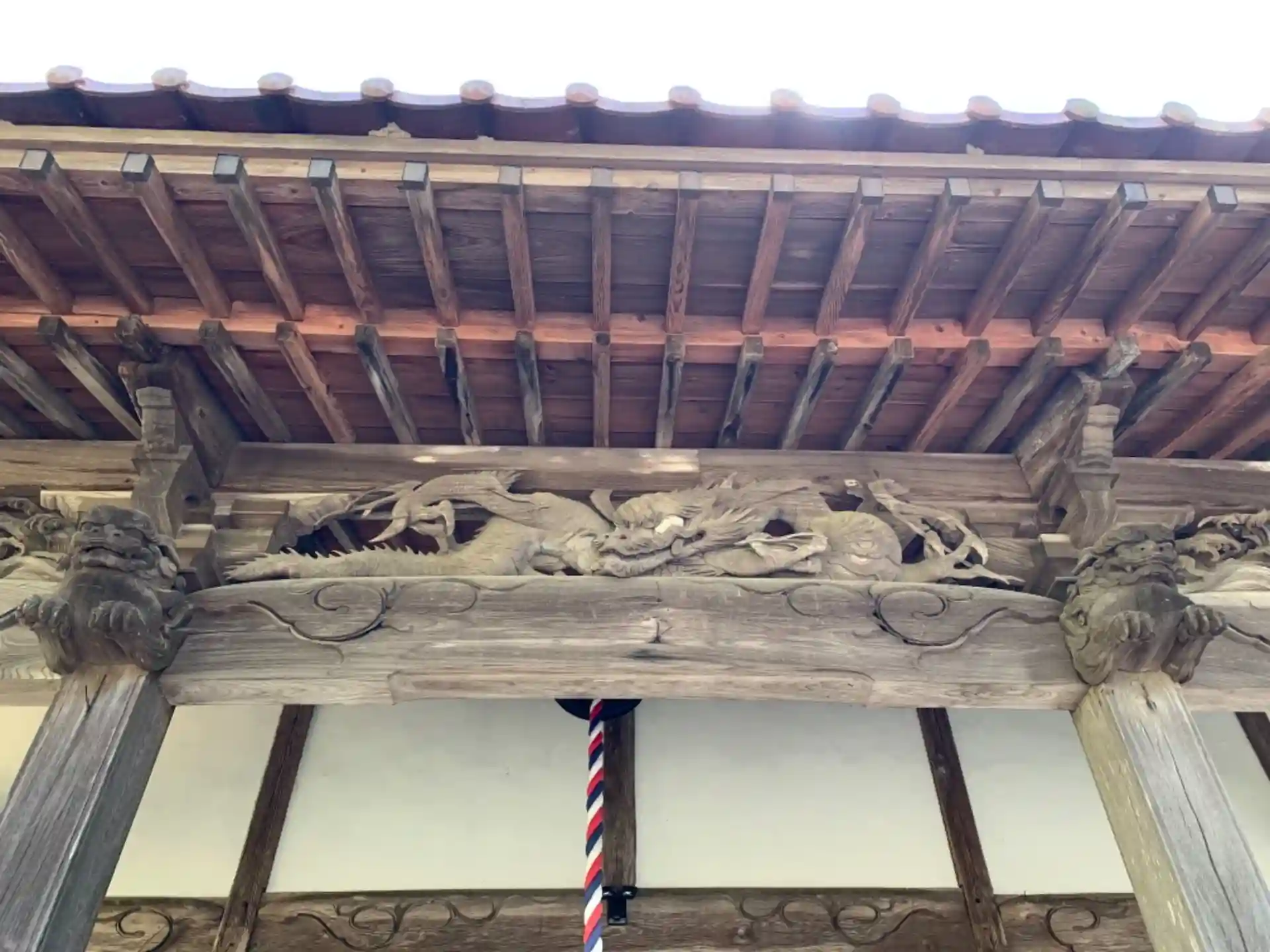 彫刻の作者は波の伊八で、中央に龍、両側に波と犀が配されています。