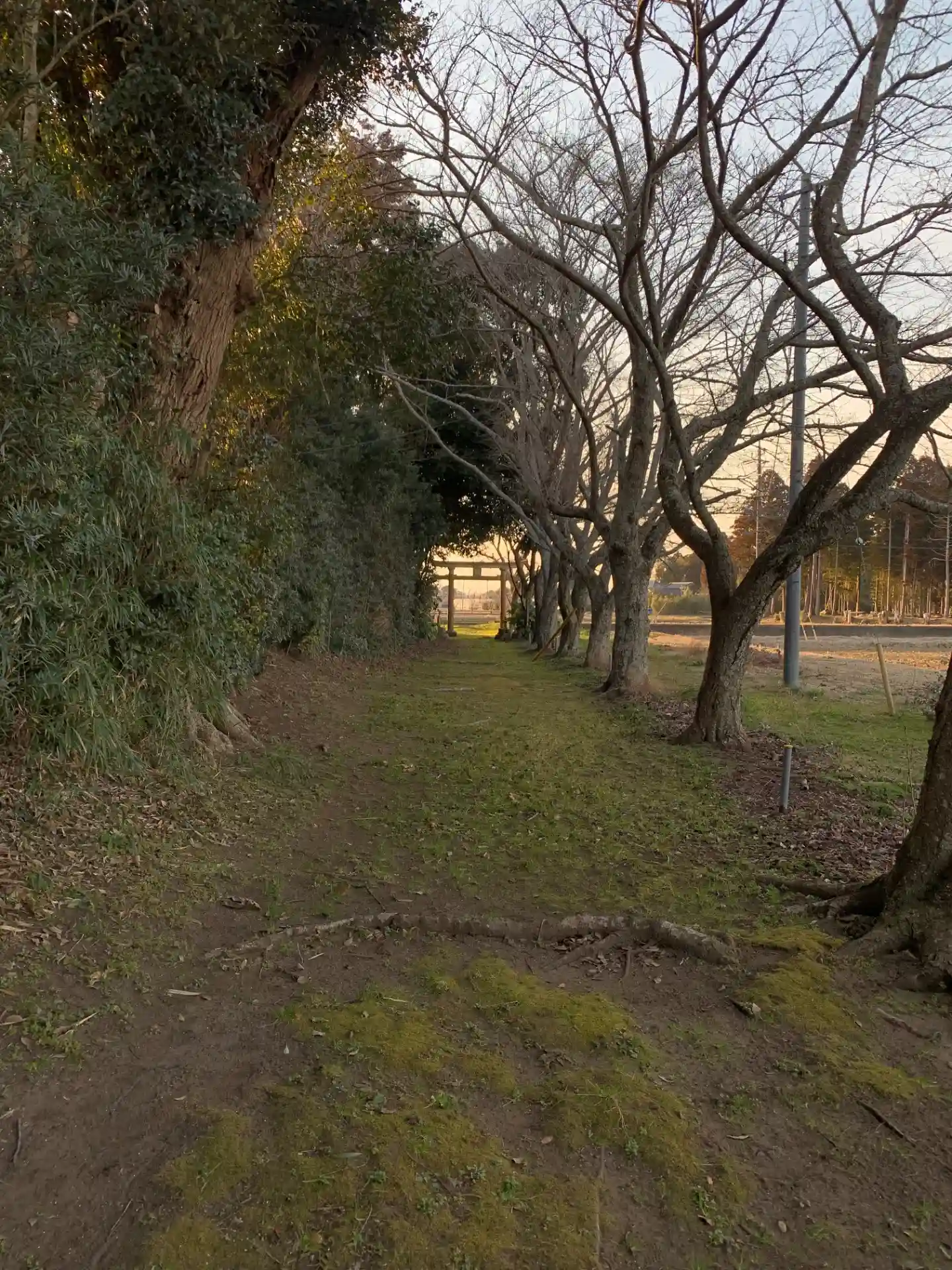 長い参道に桜が植えてある神社。