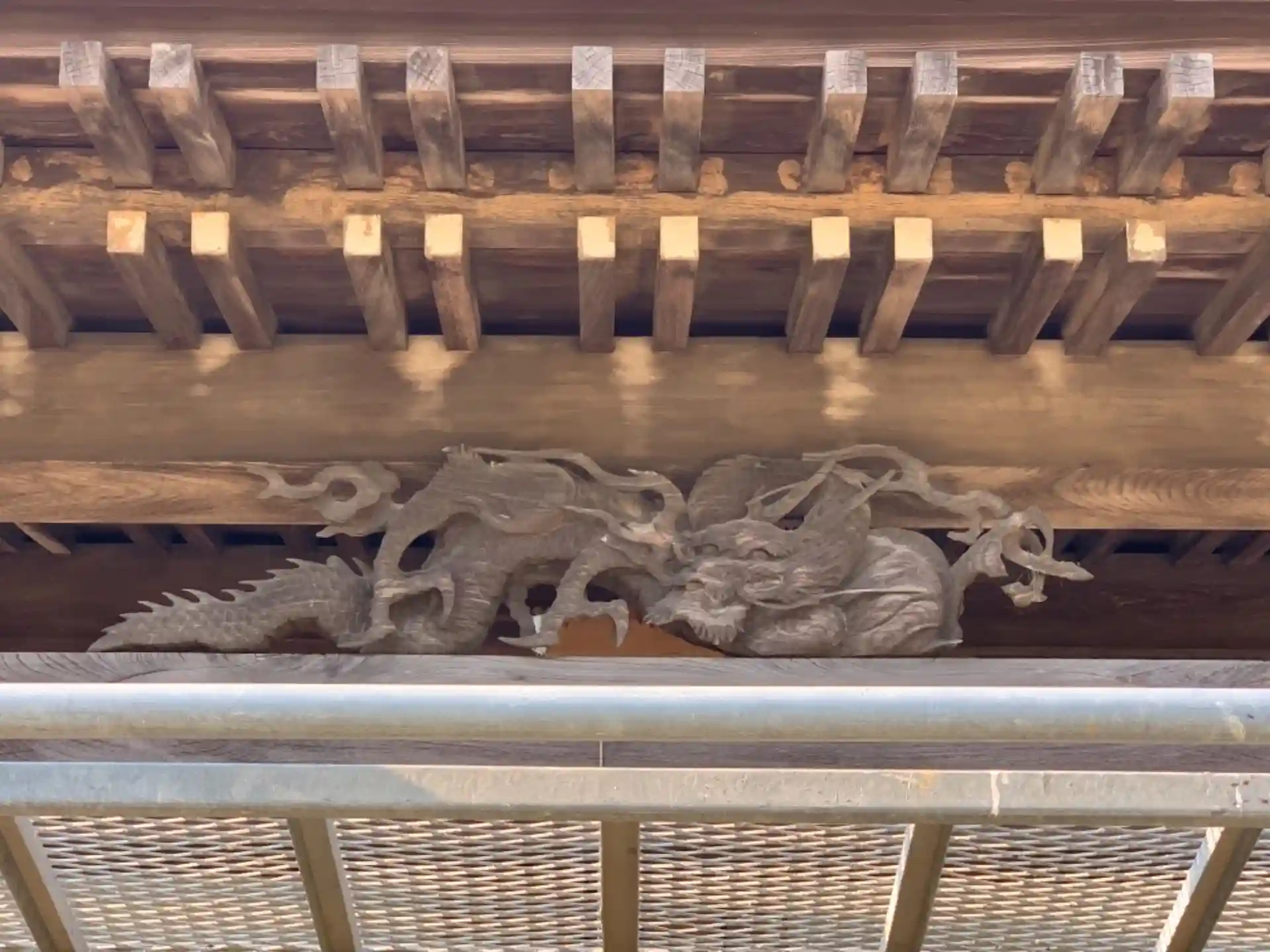 個性的な狛犬がいます。寄り目が愛おしい。向拝には龍が飾られていますが作者は不明です。