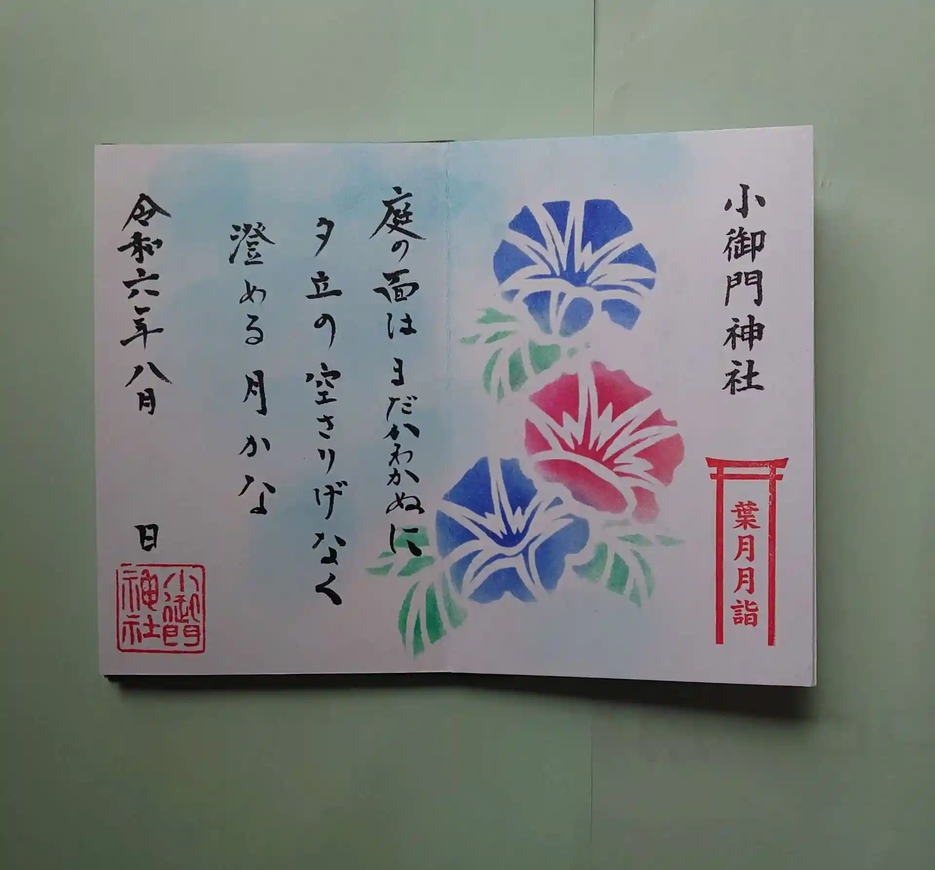 見開き御祭神和歌の御朱印8月分と、8月月詣になります。