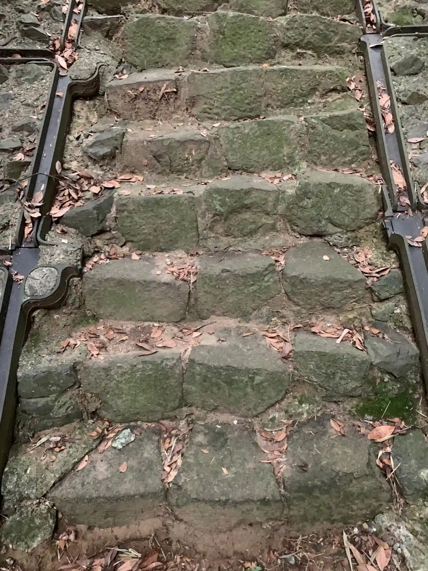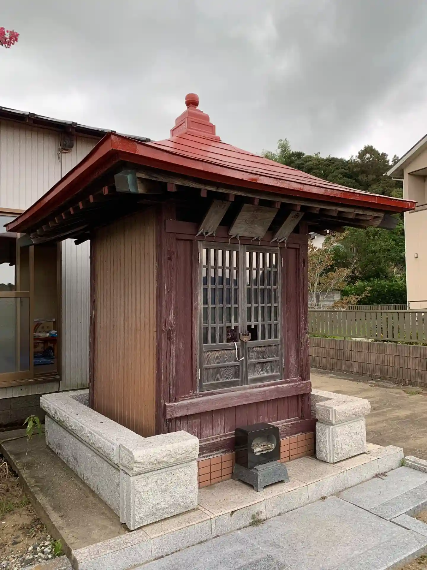 民家の隙間に入り口があります。石段は途中から石垣のような変わった積み方になります。鳥居の脇には大師堂がありました。