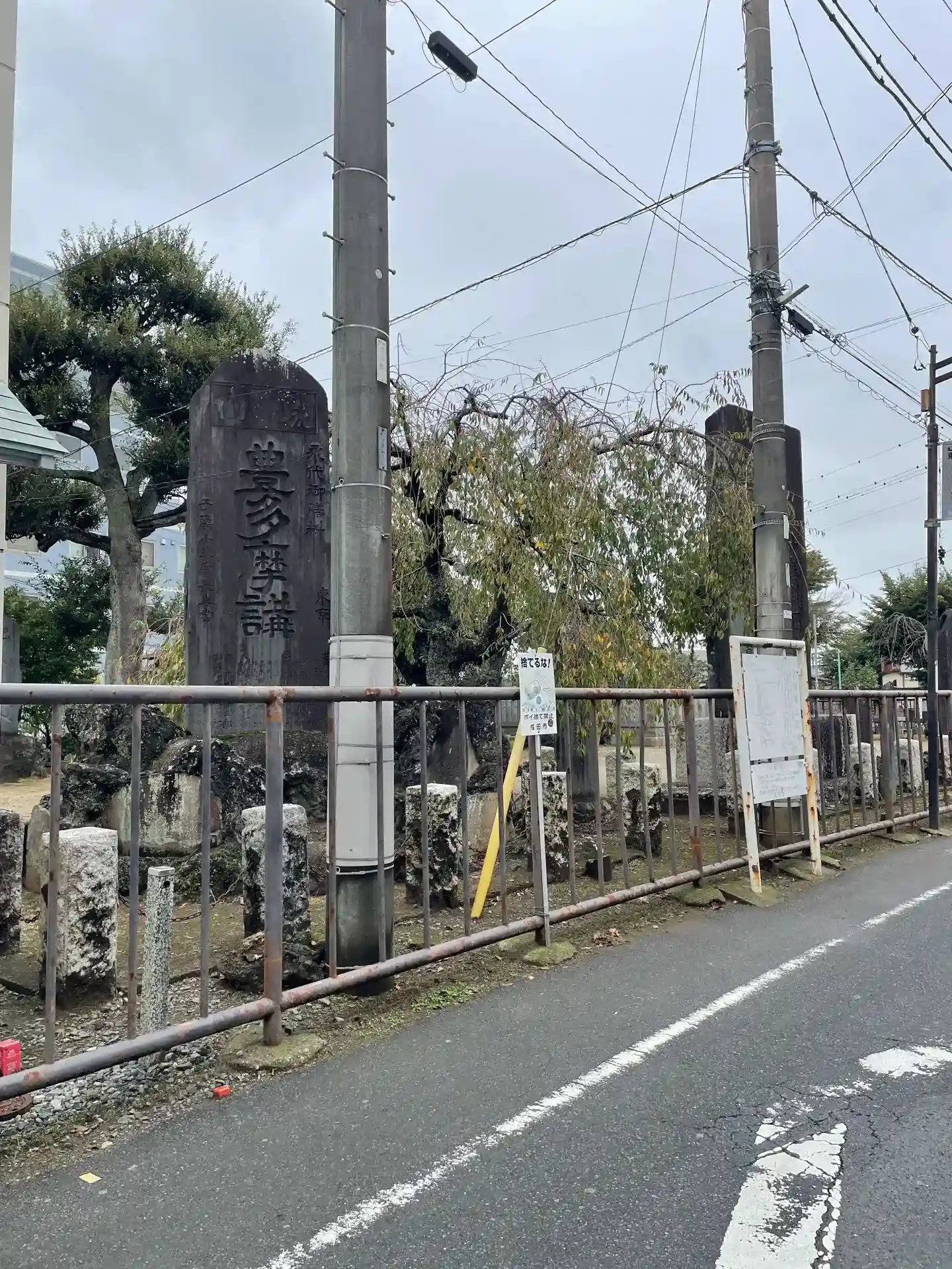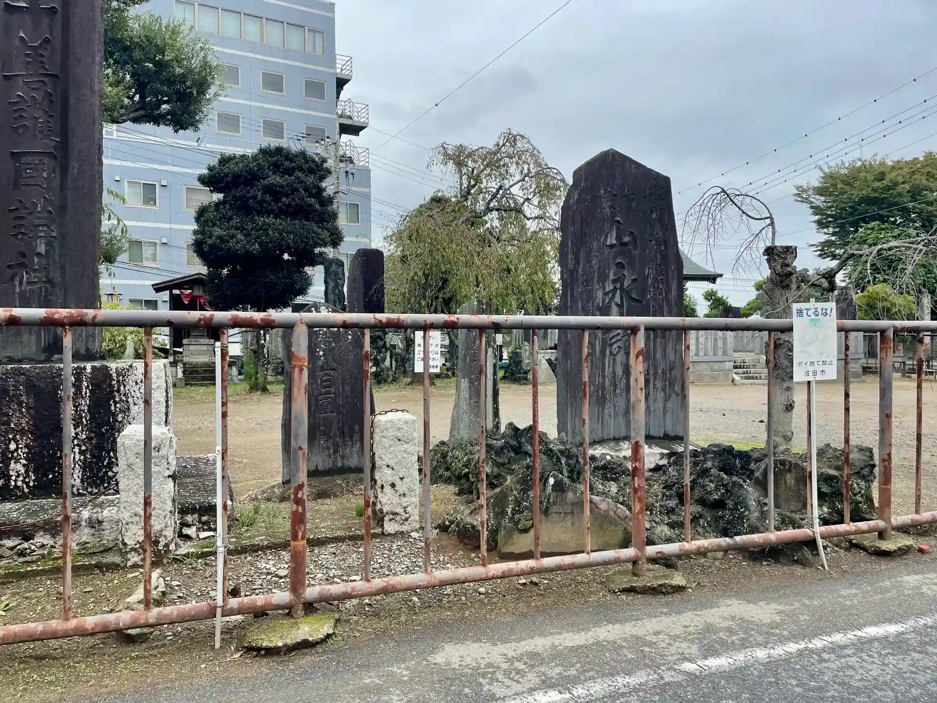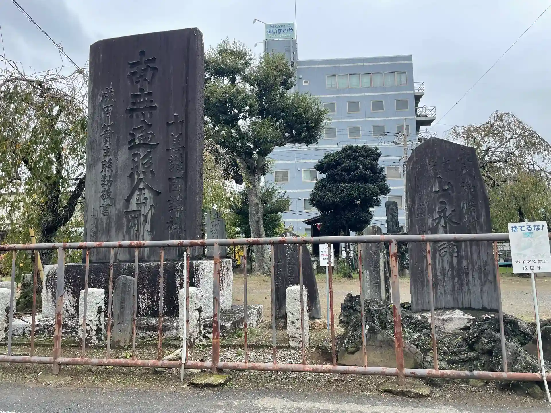 JR成田駅東口交番の脇にある権現山と呼ばれる柵に囲まれた広場の一角にあり、ここは成田山新勝寺の境外地となっている。