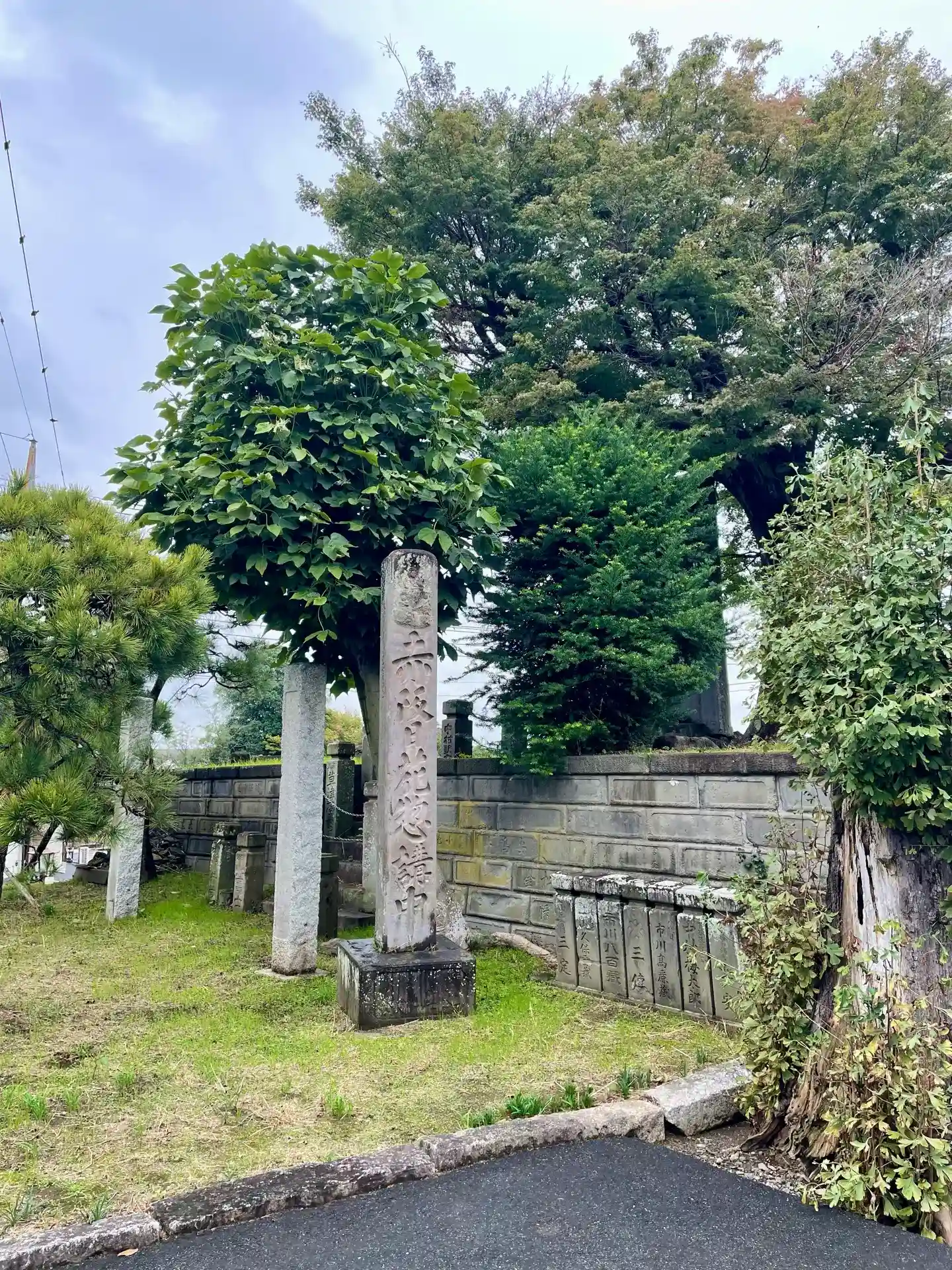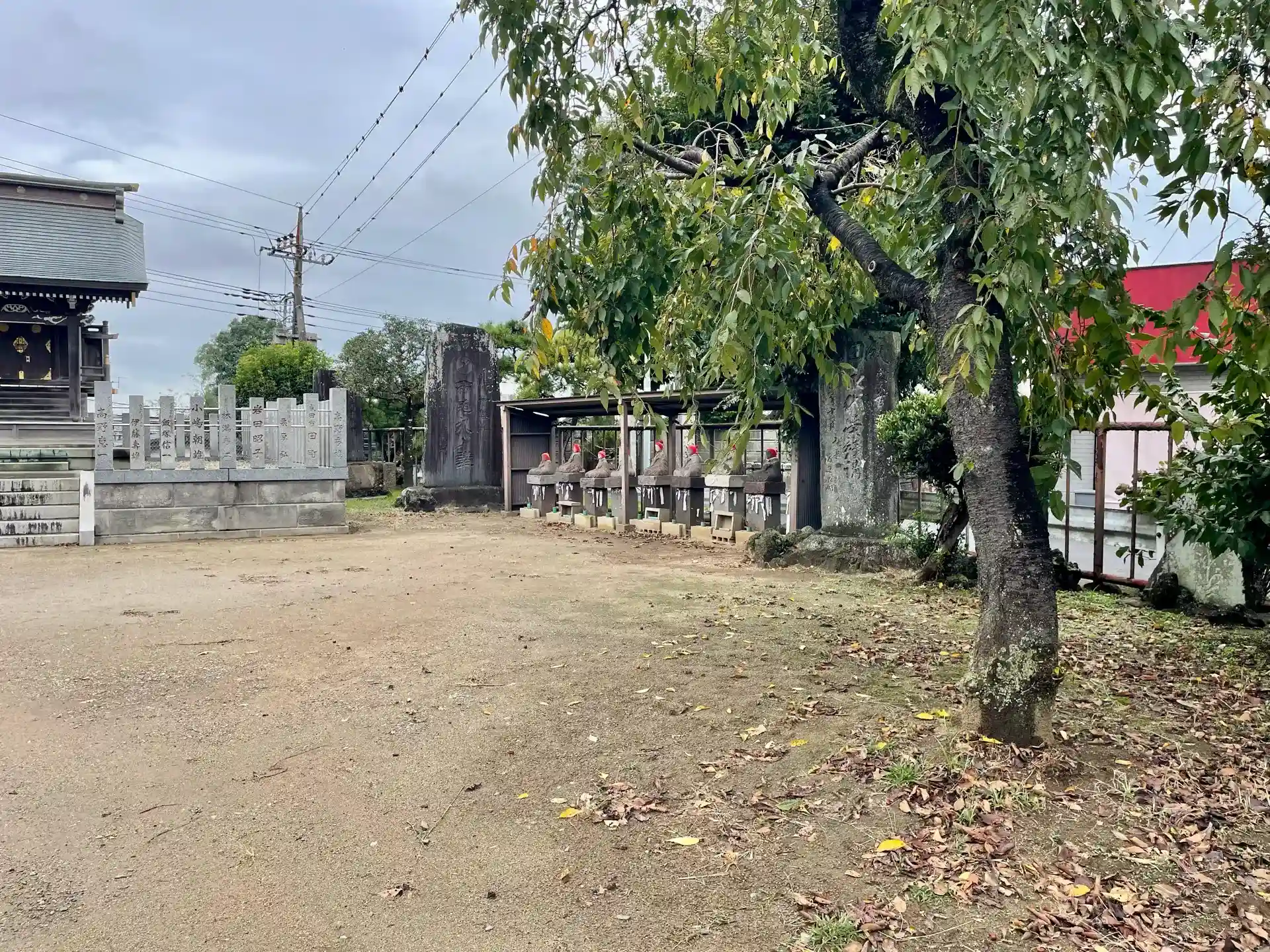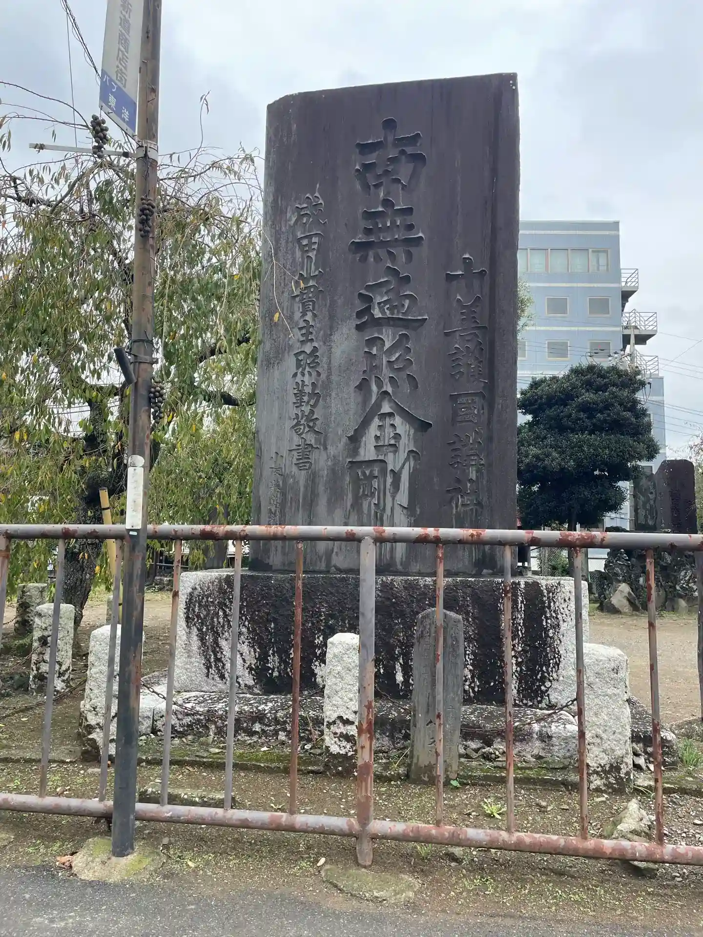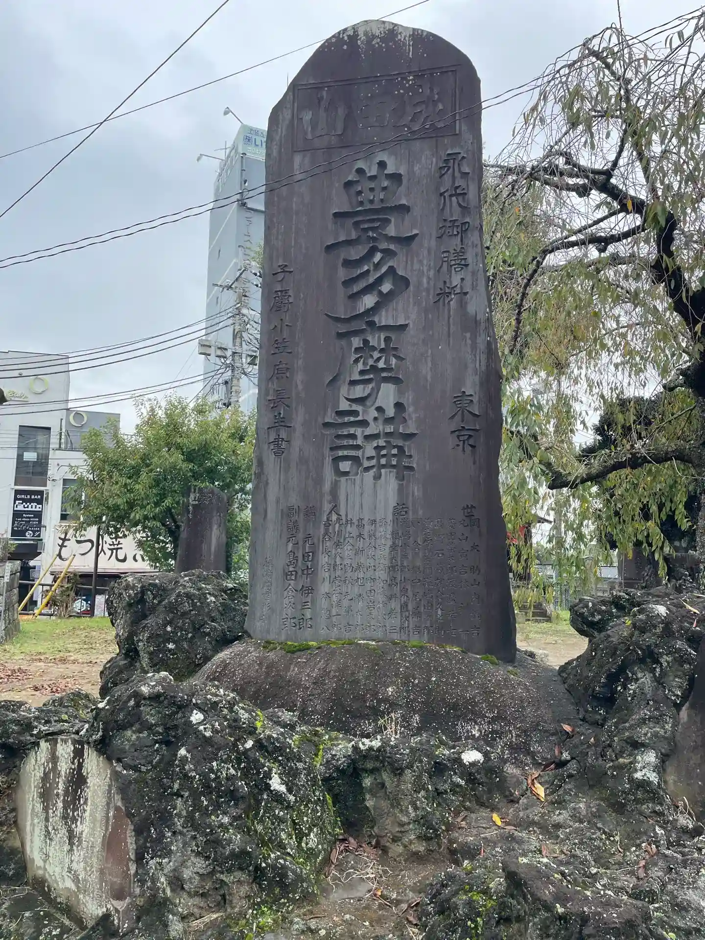 JR成田駅東口交番の脇にある権現山と呼ばれる柵に囲まれた広場の一角にあり、ここは成田山新勝寺の境外地となっている。