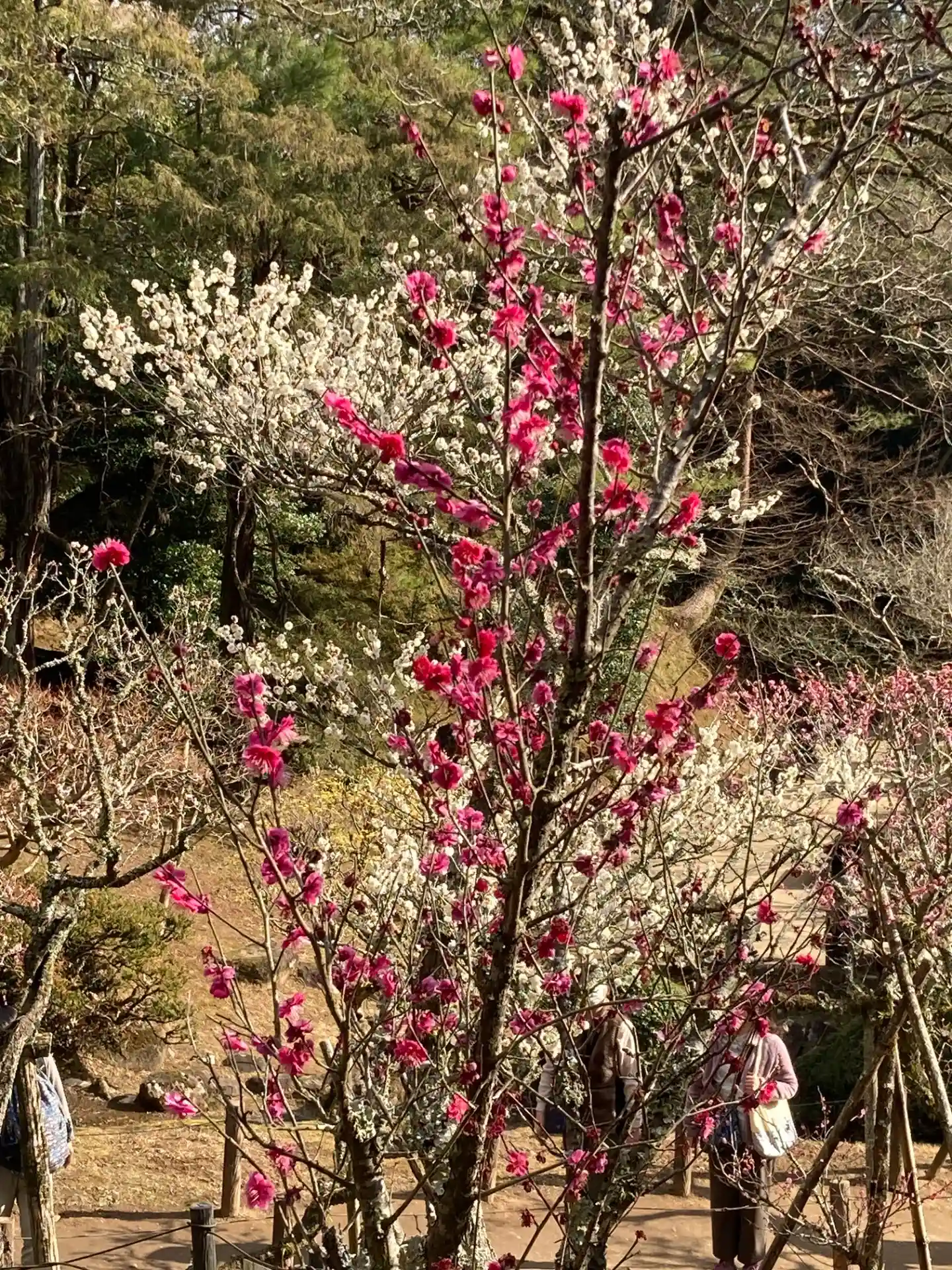 本堂へのお参りもかなりの長い列で時間を要しました。授与所で家内安全の御札と御守りを頂き、釈迦堂や醫王堂、平和大塔など主だった堂宇にもお参りし、目的の成田山公園へ。ちょうど「梅祭り」開催中で、園内の広場では大勢のお客さんが和琴の生演奏に聴き入ってました。境内から少し下った地形からか、日当たりの影響か、紅梅も白梅も5〜6分咲きといった所。それでも多くの参拝客がスマホをかざして撮影を楽しんでいました。
