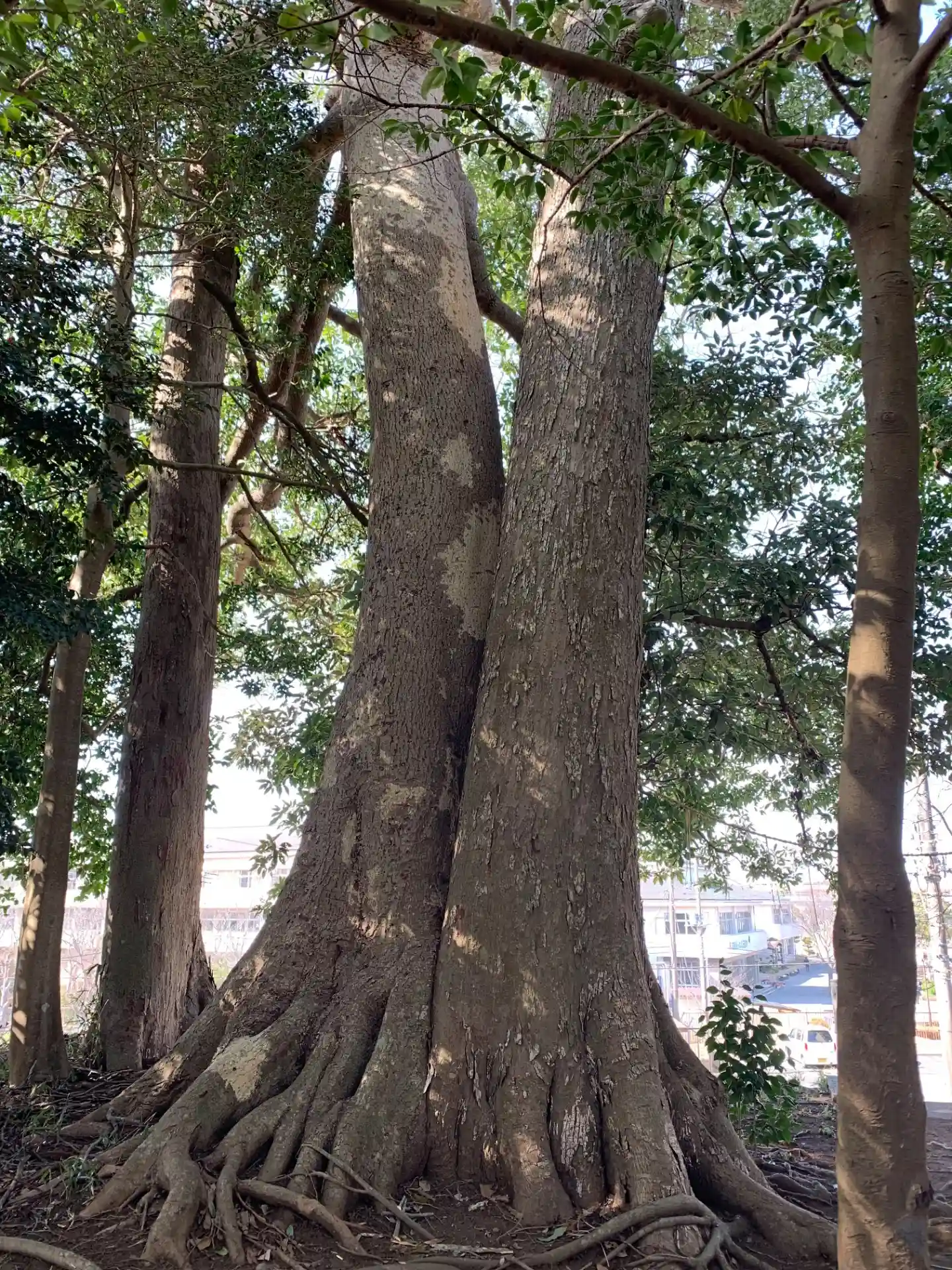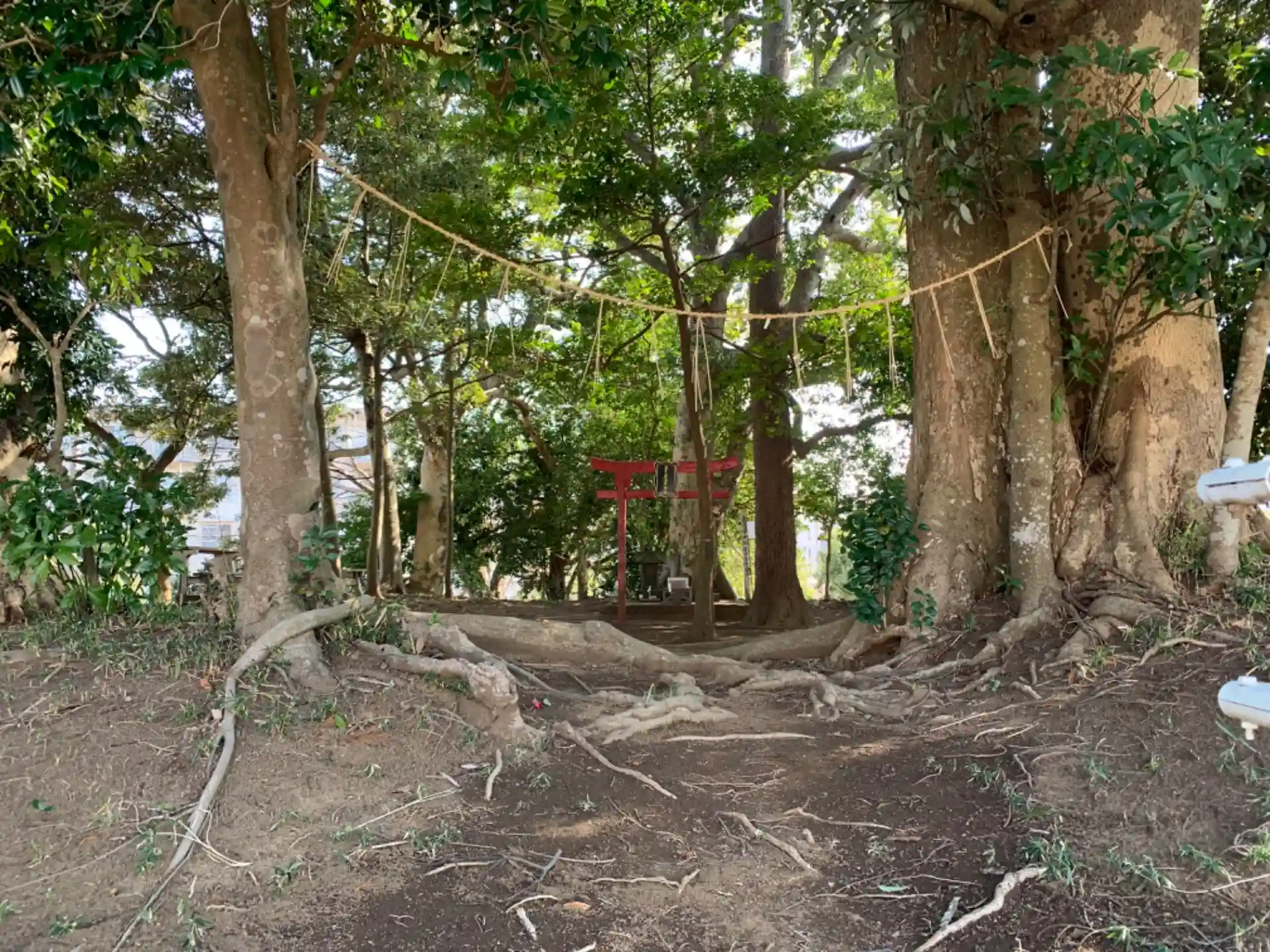 住宅地に残る小山に祠があります。古墳っぽくなっているのはわざとそのようにしたとのこと。タブノキとムクノキが根を絡めて生えており、地元の方はこれを恋人の木と呼んでいるそうです。