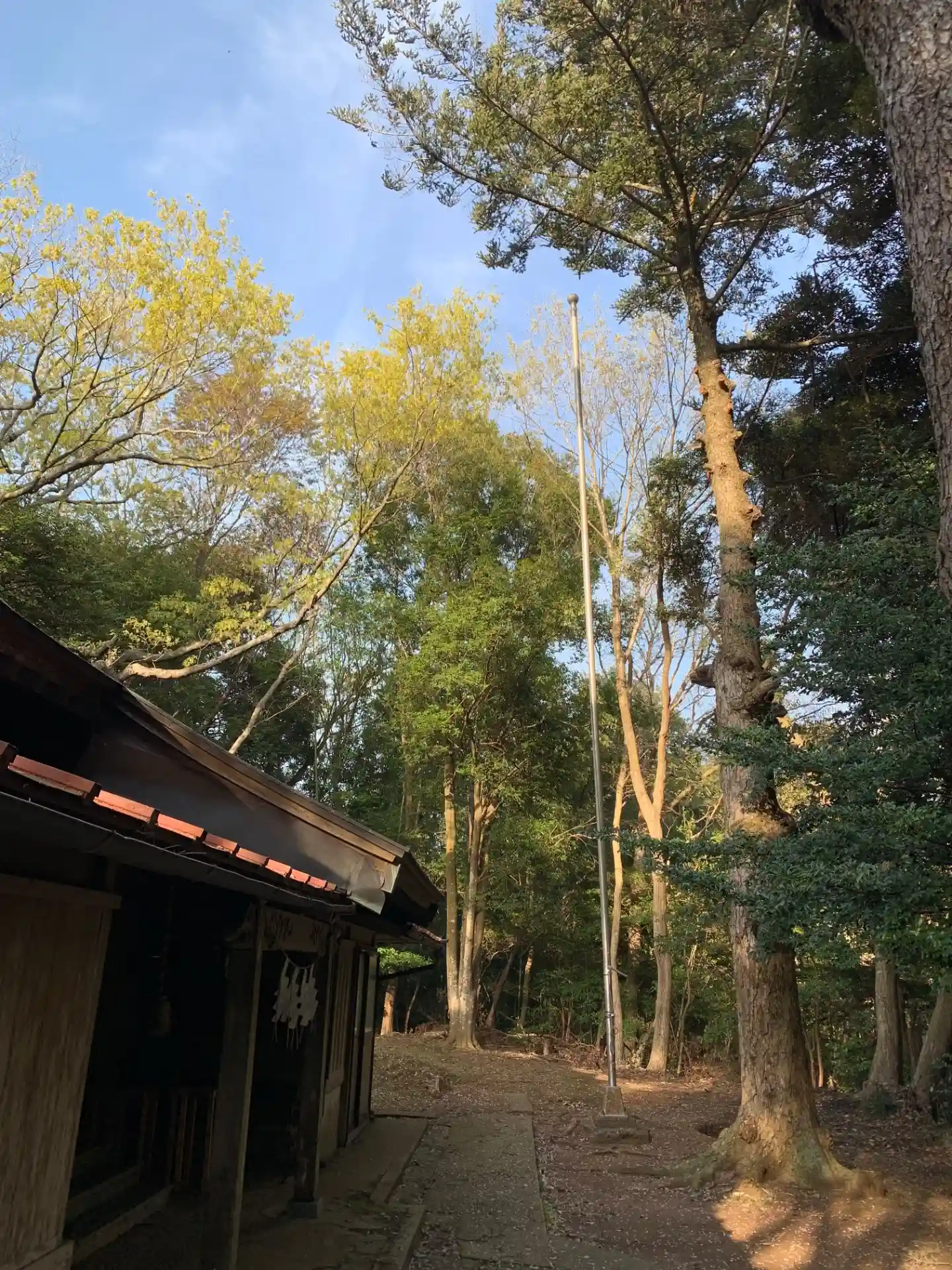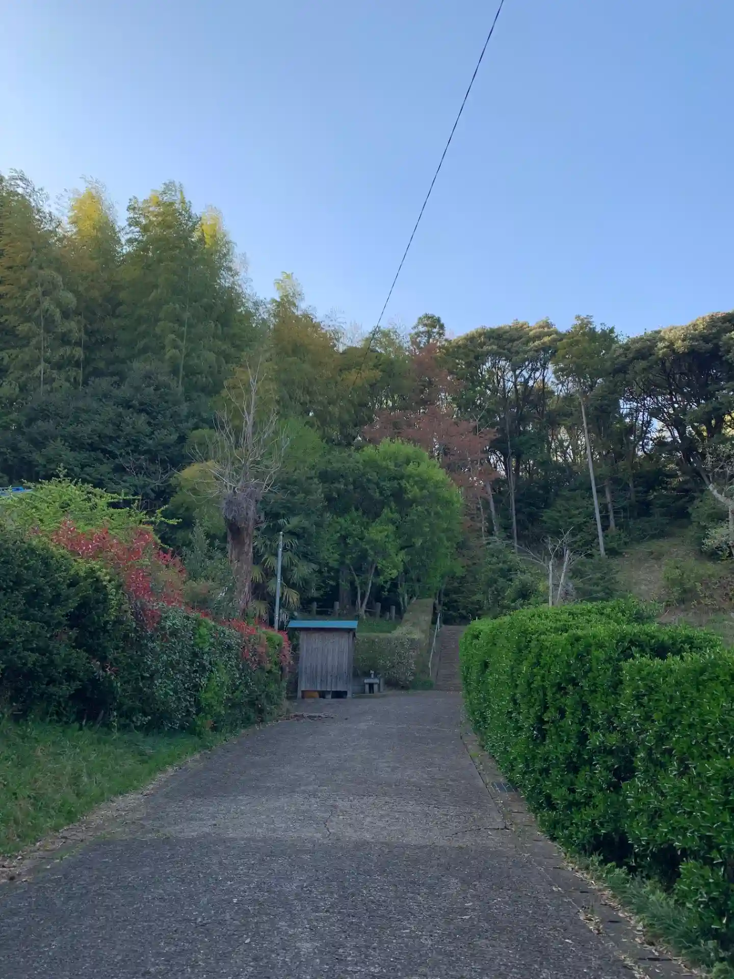 辺田集落の奥にある神社。囲い付きの仮設トイレや水道施設などインフラが整っています。急な石段の先に社殿があります。