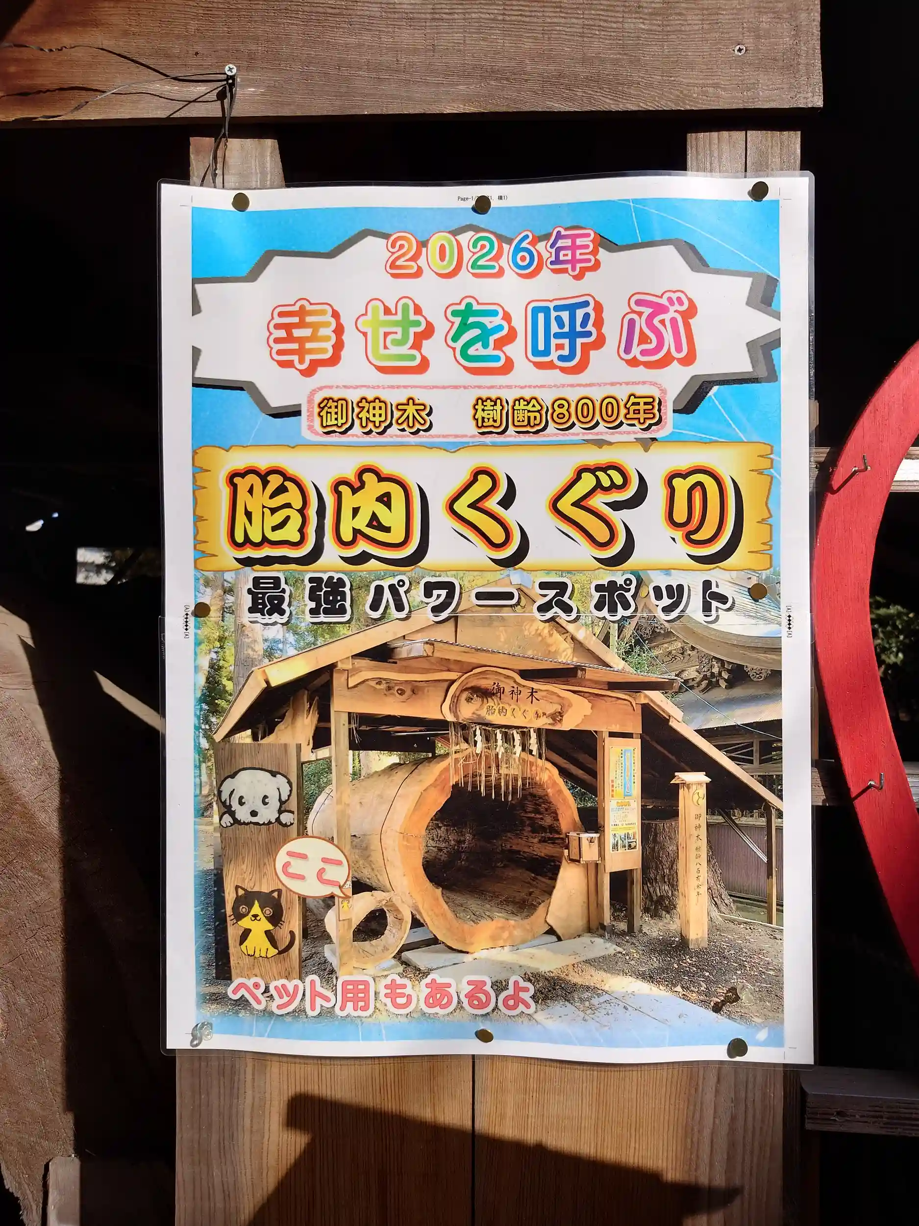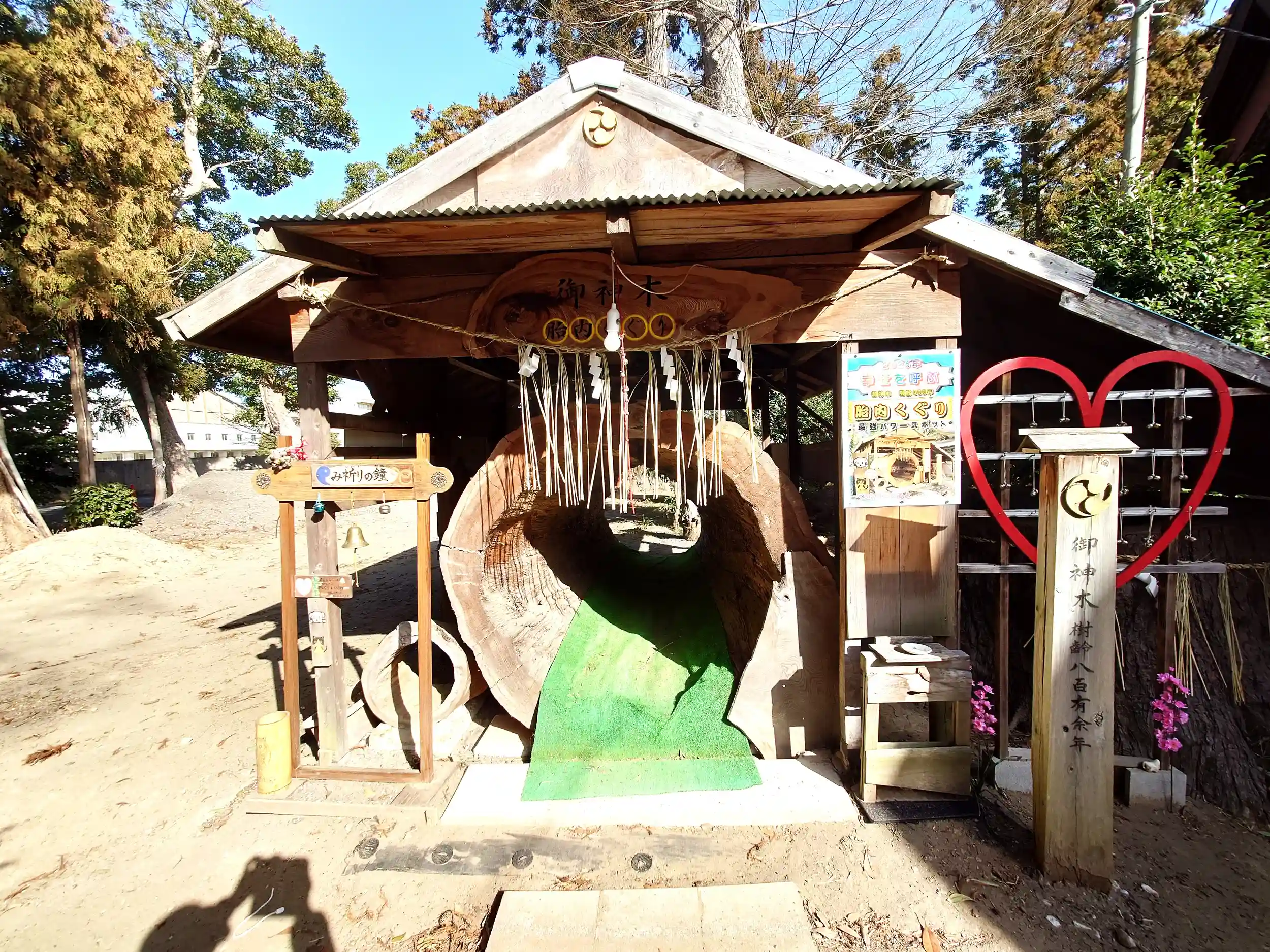 ・2019年に台風で倒伏してしまった樹齢800年の御神木の内部をくり抜き『胎内くぐり』ができるアトラクションがあります。