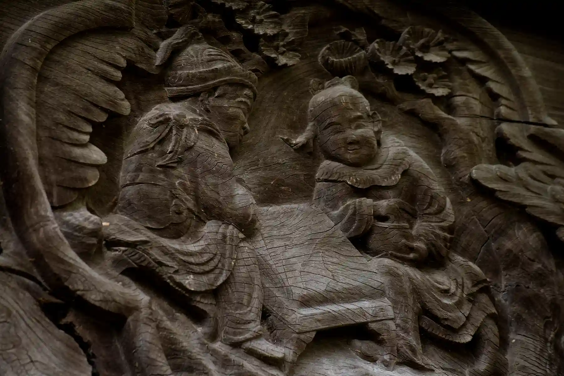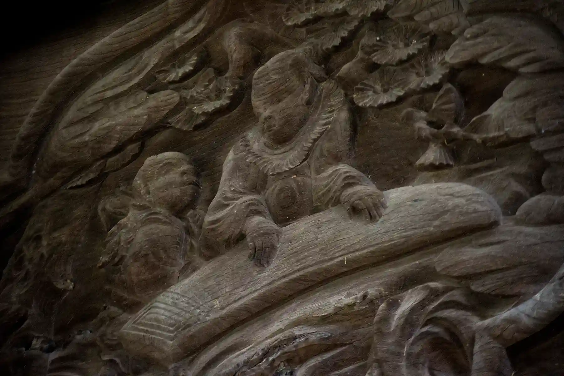 本殿の彫刻は、誠に見事です!海老紅梁は竜の丸彫りになっており大変精緻な彫刻です。また、宝珠金具の刻銘により天保2年1831年に造営ということ推測されます。東側の彫刻の前には「琴を奏する彫刻の不思議」と書かれた銘板があり、こちらの酉の市の舞台で無名の演歌歌手等が歌ったところ、立て続けに紅白歌合戦に出場するほどのヒットに恵まれたそうな。これは、琴を弾く彫刻と脇障子に点数を付けているような彫刻があり、そのご利益からなのではないか云々とありました。