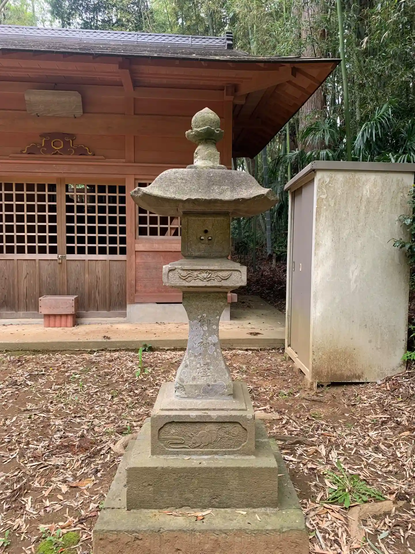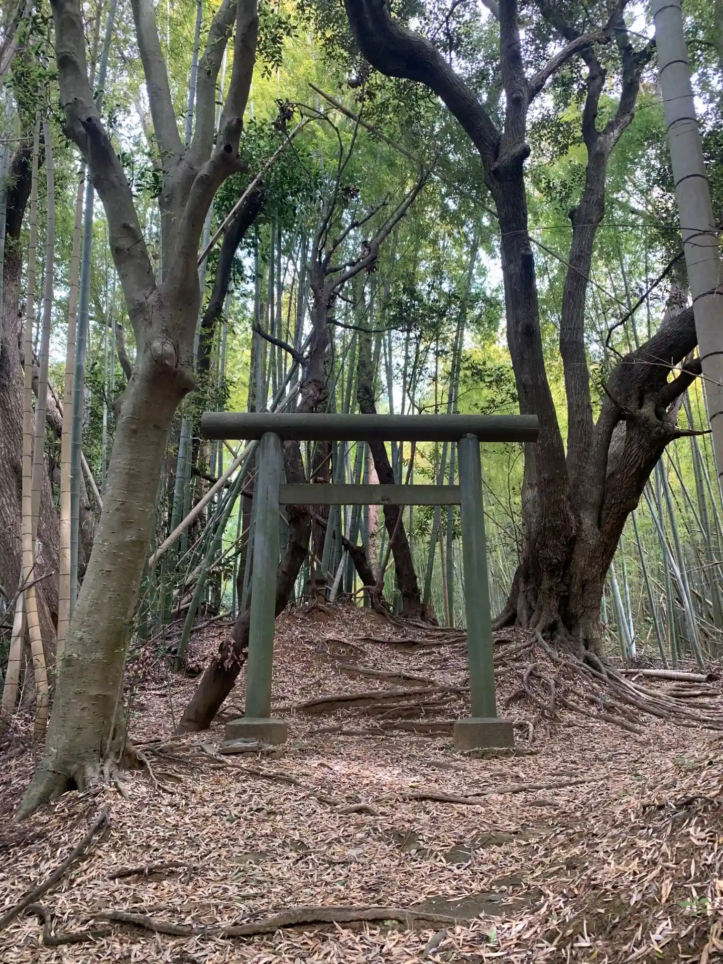 道路沿いに鳥居があり、竹林の中の石段を抜けたところにも鳥居があります。参道には塚と祠がありました。