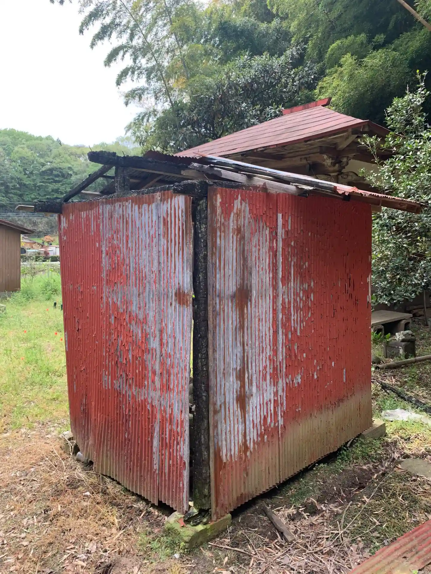 寺務所と大師堂だけが残されています。本堂の基礎が残っており、本堂に近い方の大師堂が焦げていたので全勝したと思われます。