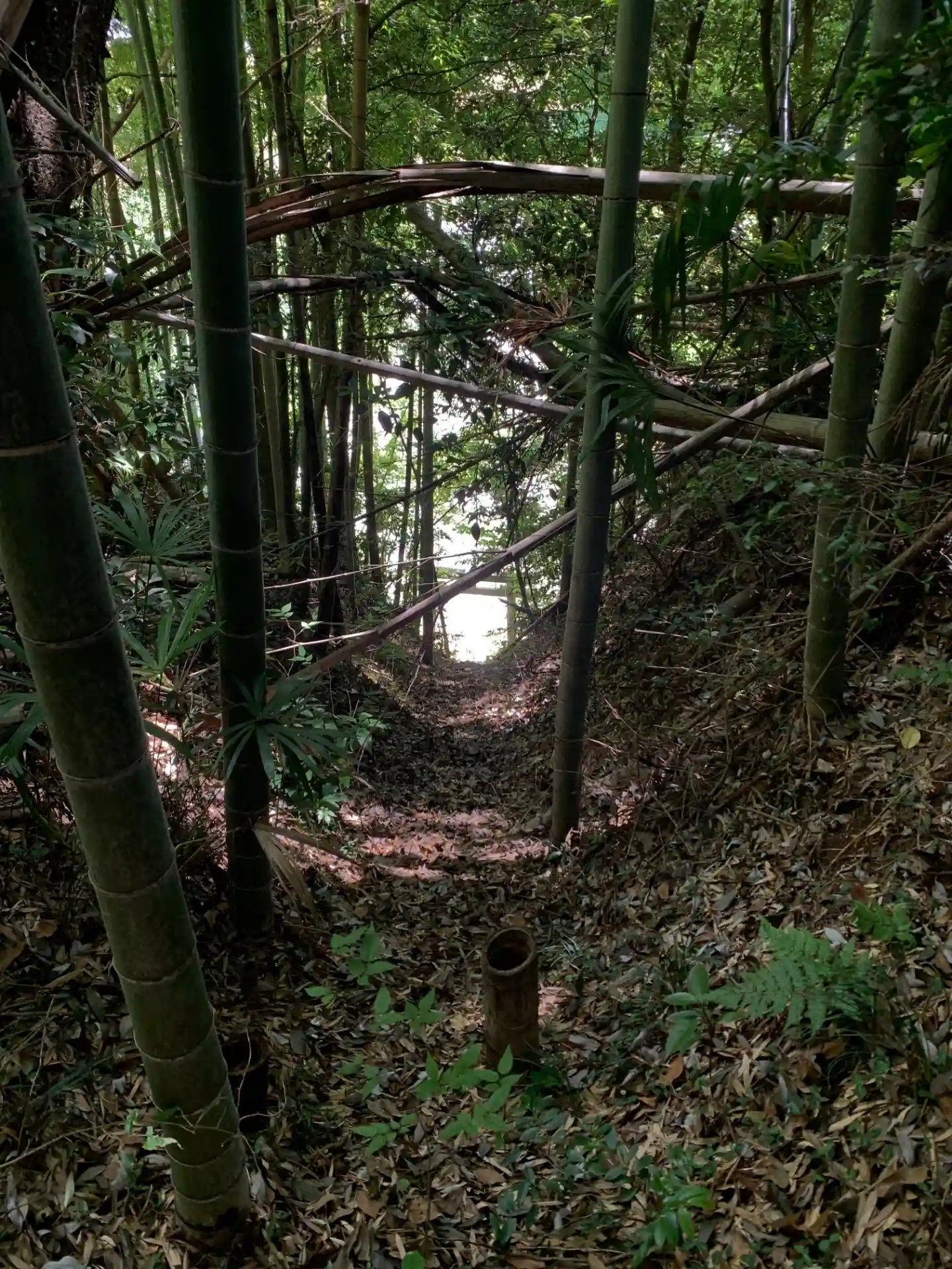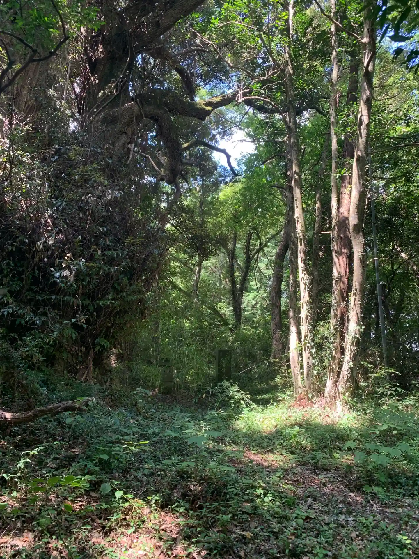 ほぼ直登みたいな参道です。無理はしないでください。おそらく台風などの風雨で崩れたものと思われます。竹や木の根、足場のようなわずかな段差を頼りに登ると浅間神社碑と琴平神社祠があります。