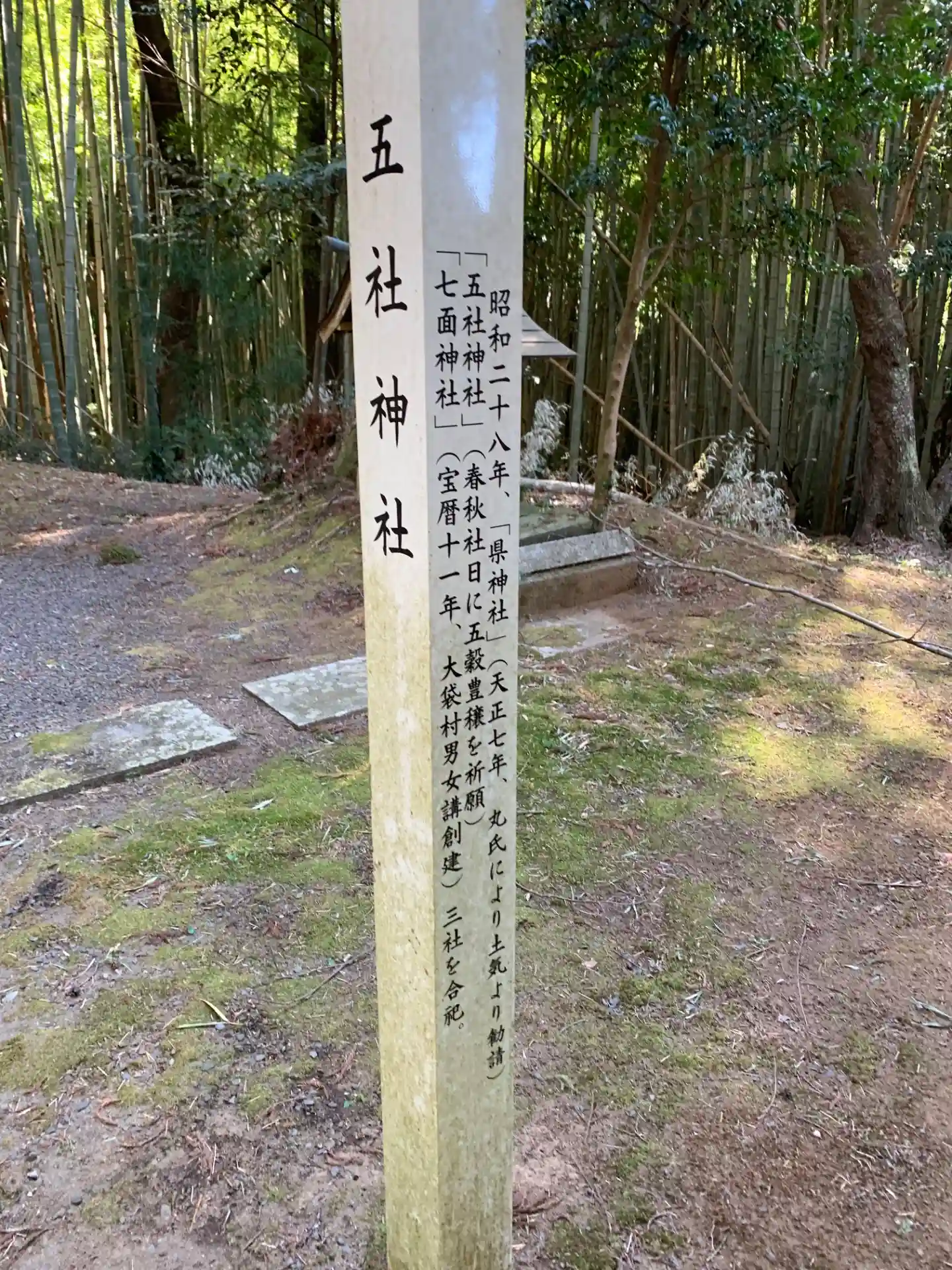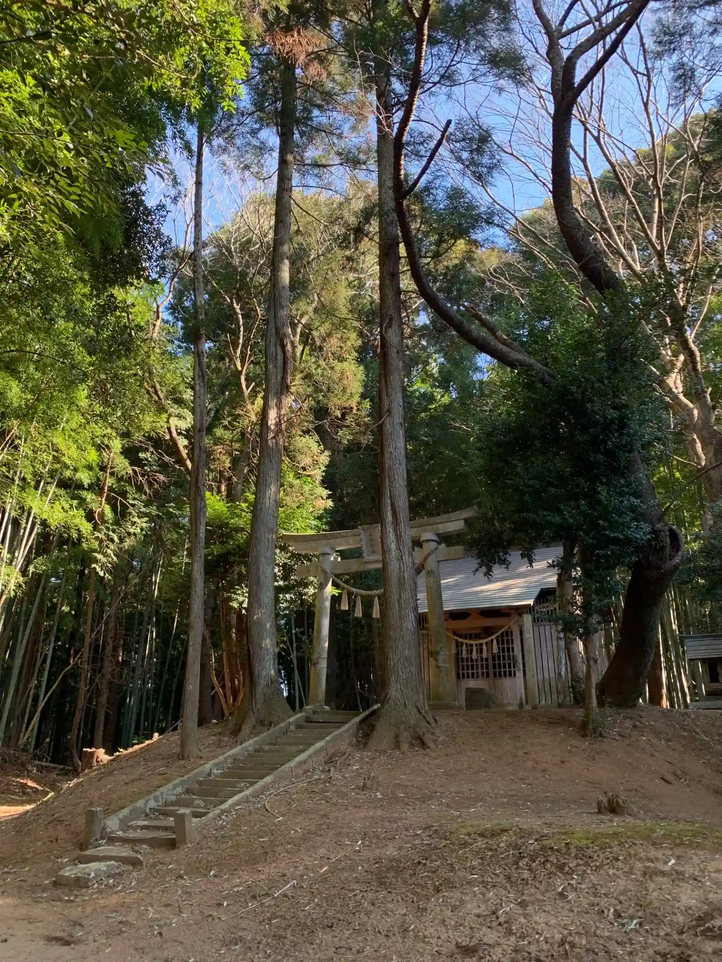 竹林に囲まれた神社。屋根付きの土俵があります。東側へ伸びる古道のようなものがありますが、入ってすぐ途切れていました。