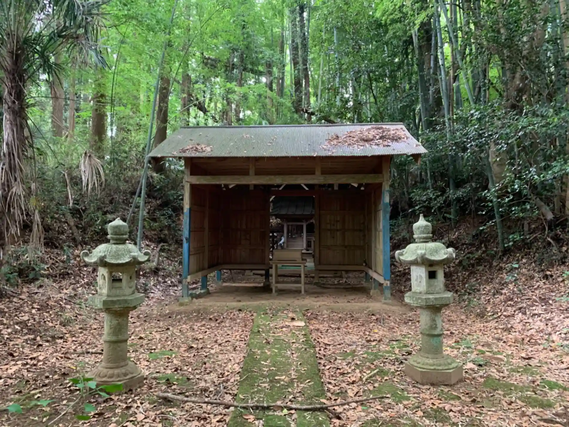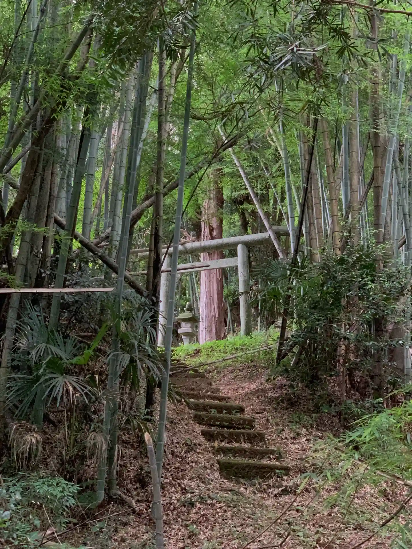 城址に建つ神社。鳥居手前の参道が藪に覆われかけていました。とても雰囲気の良い竹林の中にありました。