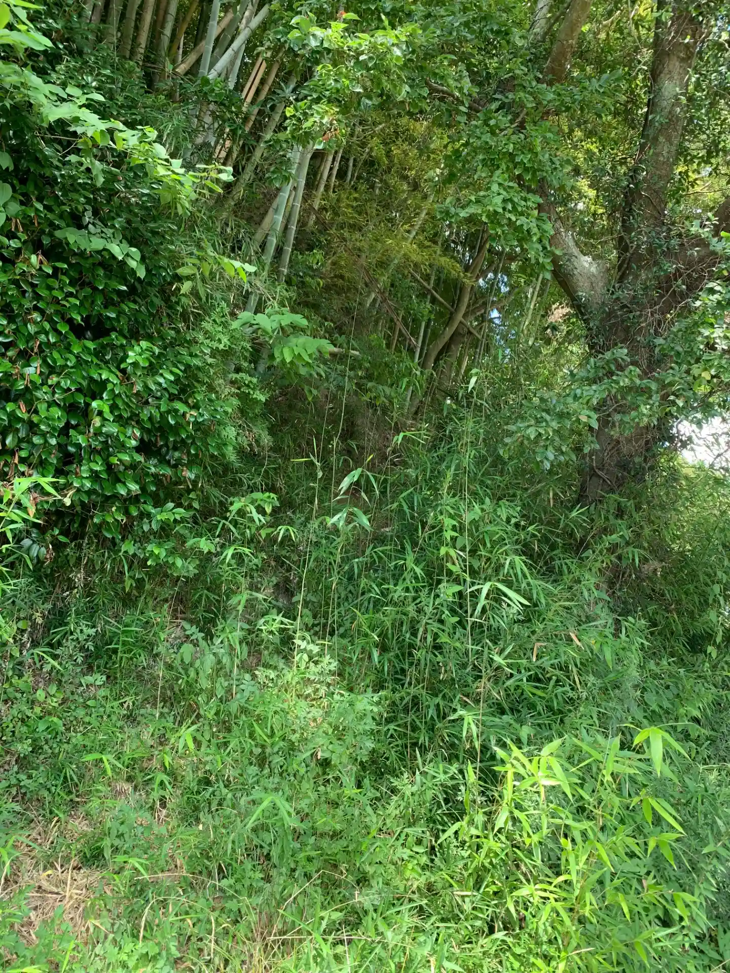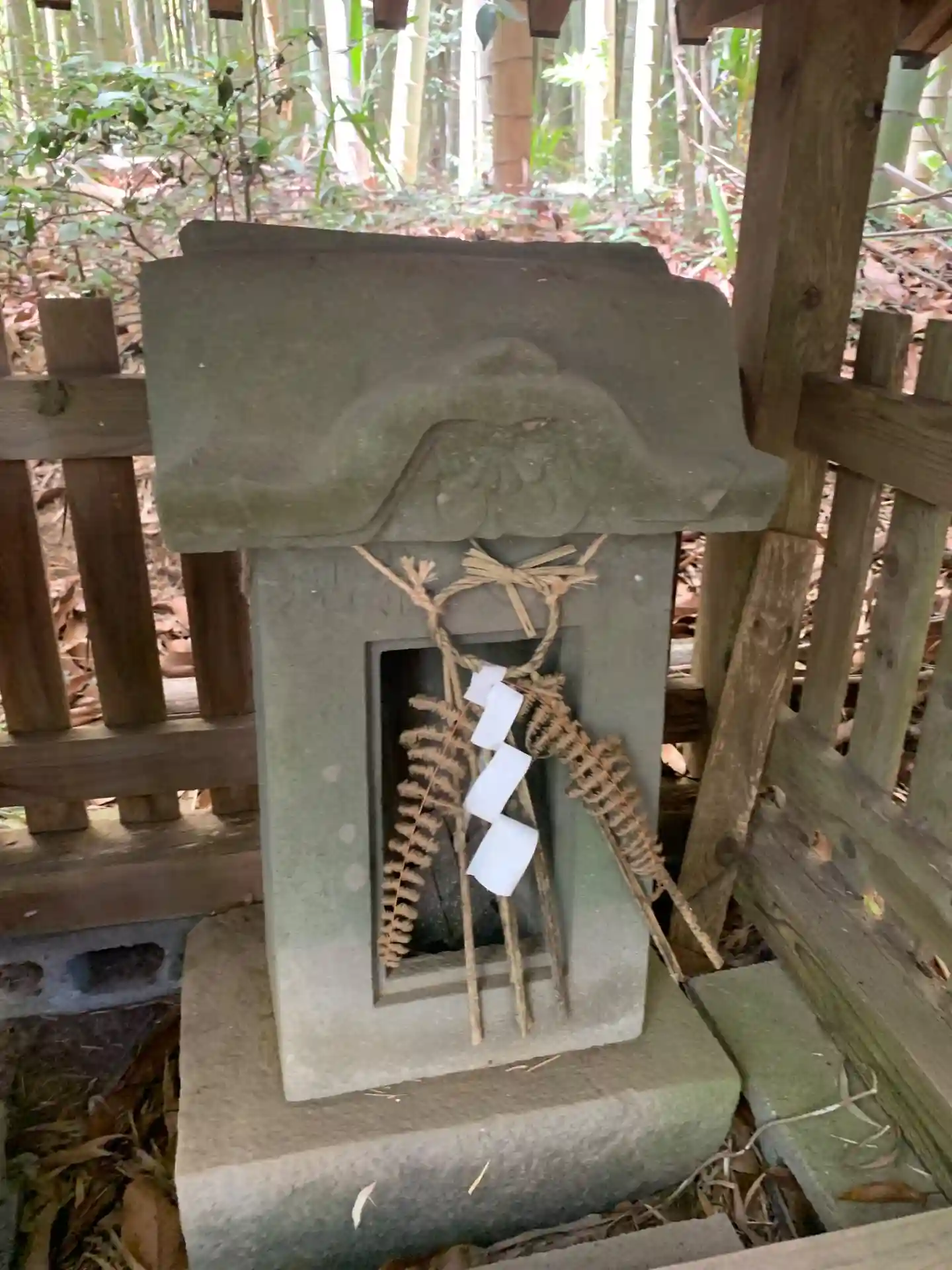参道はほとんど崩れており、竹や竹の根を手がかり足掛かりにしてようやく登れます。滑落のリスクがあるのでお勧めはできません。登りきると鳥居と石祠があります。