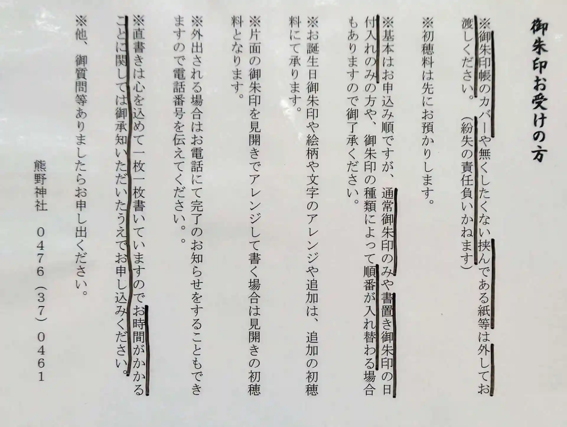 在宅でしたら表記されている番号に電話をすれば、直接御朱印をお書き入れをしてくれるようですね。