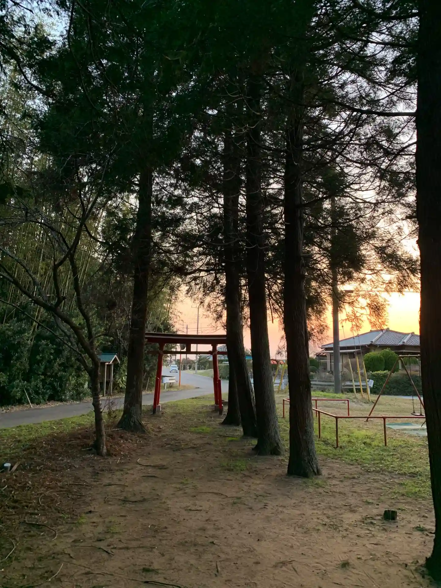 公園の脇にある神社。短いながら杉並木を備えています。