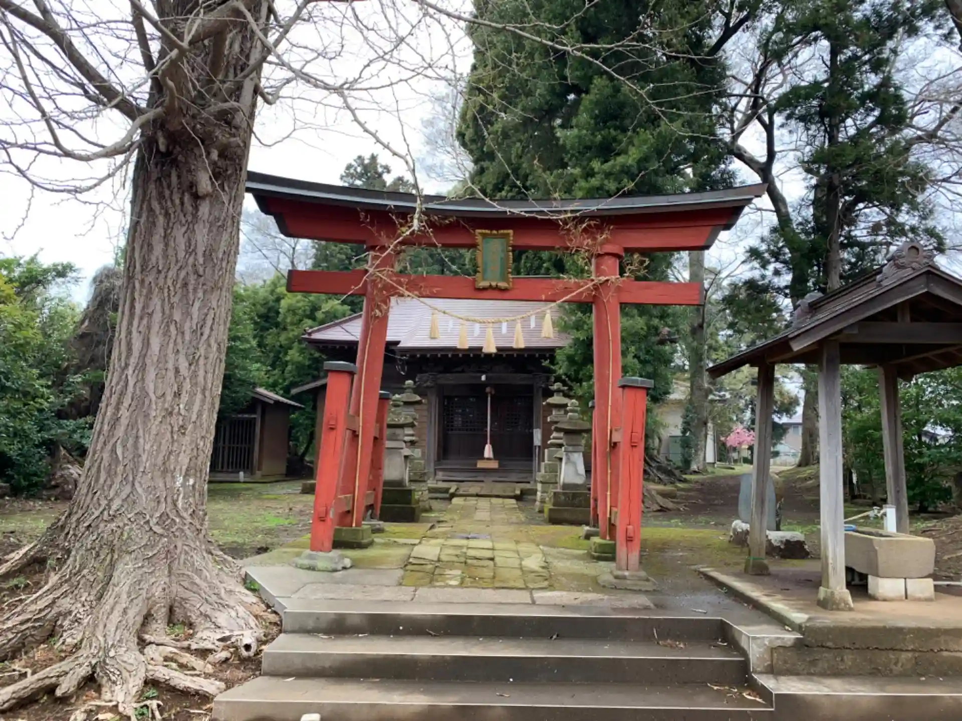 Y字路にある神社。拝殿には龍がおり、本殿は朱塗りで脇障子には人物彫刻が飾られています。鳥居の前には印旛沼干拓碑など石碑が並んでいました。