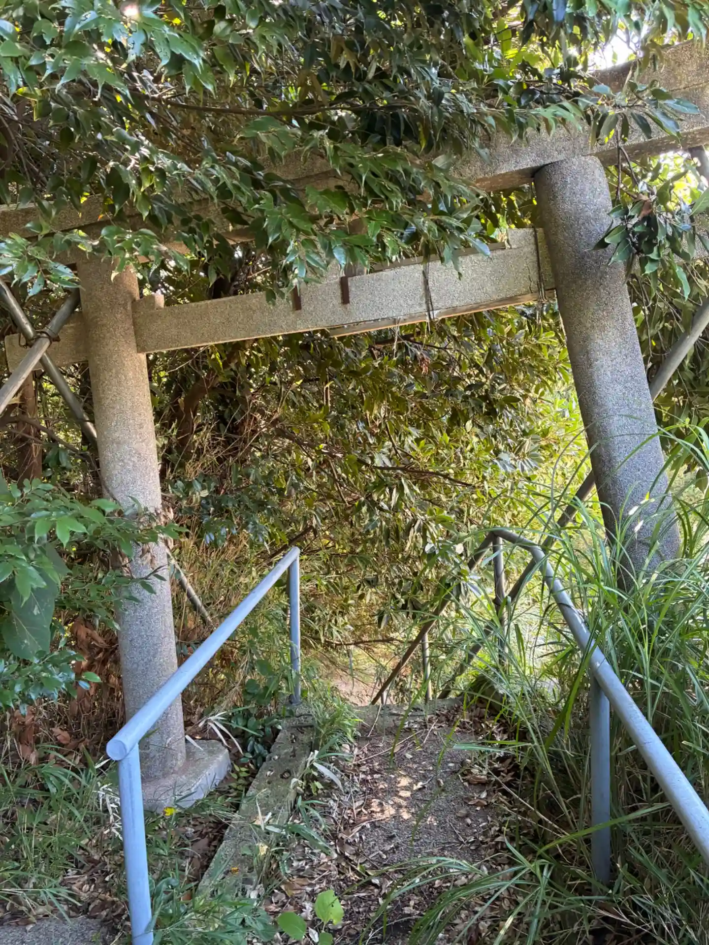 小規模分譲地と線路に挟まれた小高い丘にある祠。祠も鳥居も傾いていました。