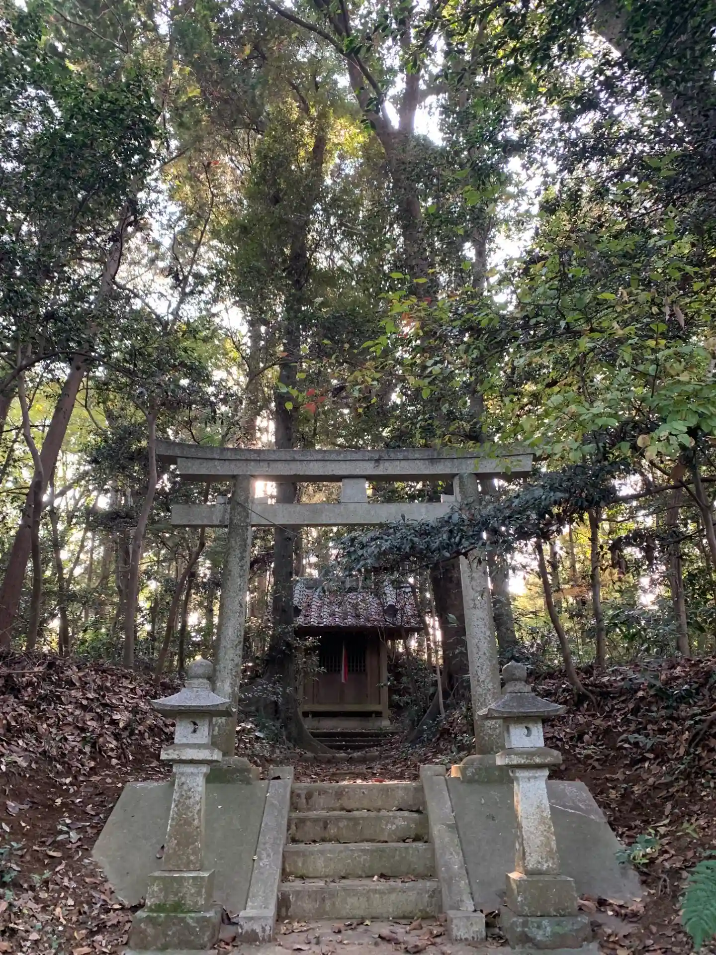 カーブミラーの奥、軽トラの轍がある細い杉林の道を進むと神社があります。秘境感ありました。