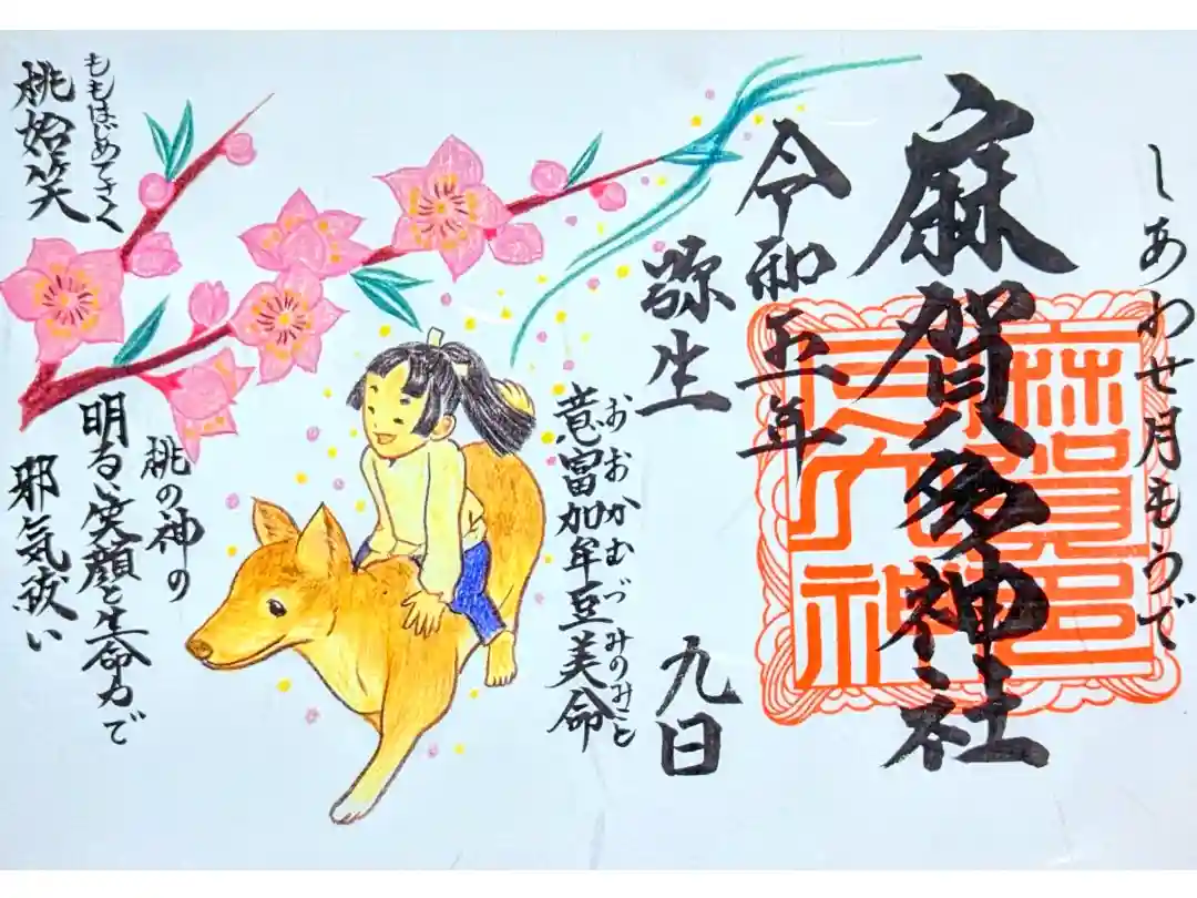 絵柄は桃の化身とされる意富加牟豆美命(おおかむづみのみこと)を禰宜画伯が描き上げました😊