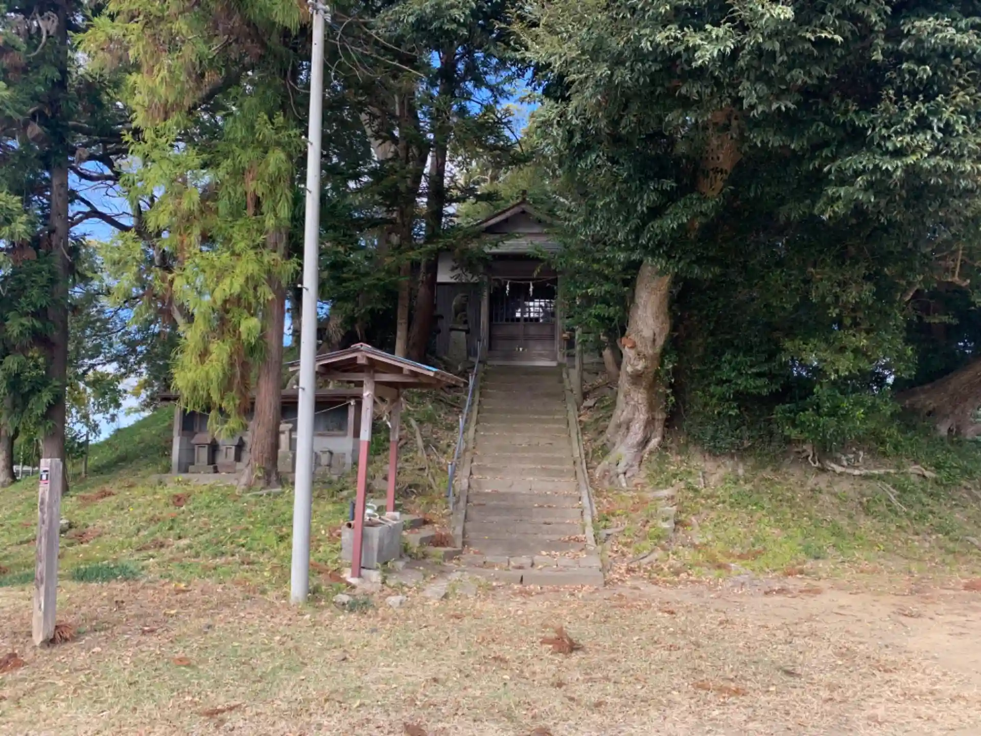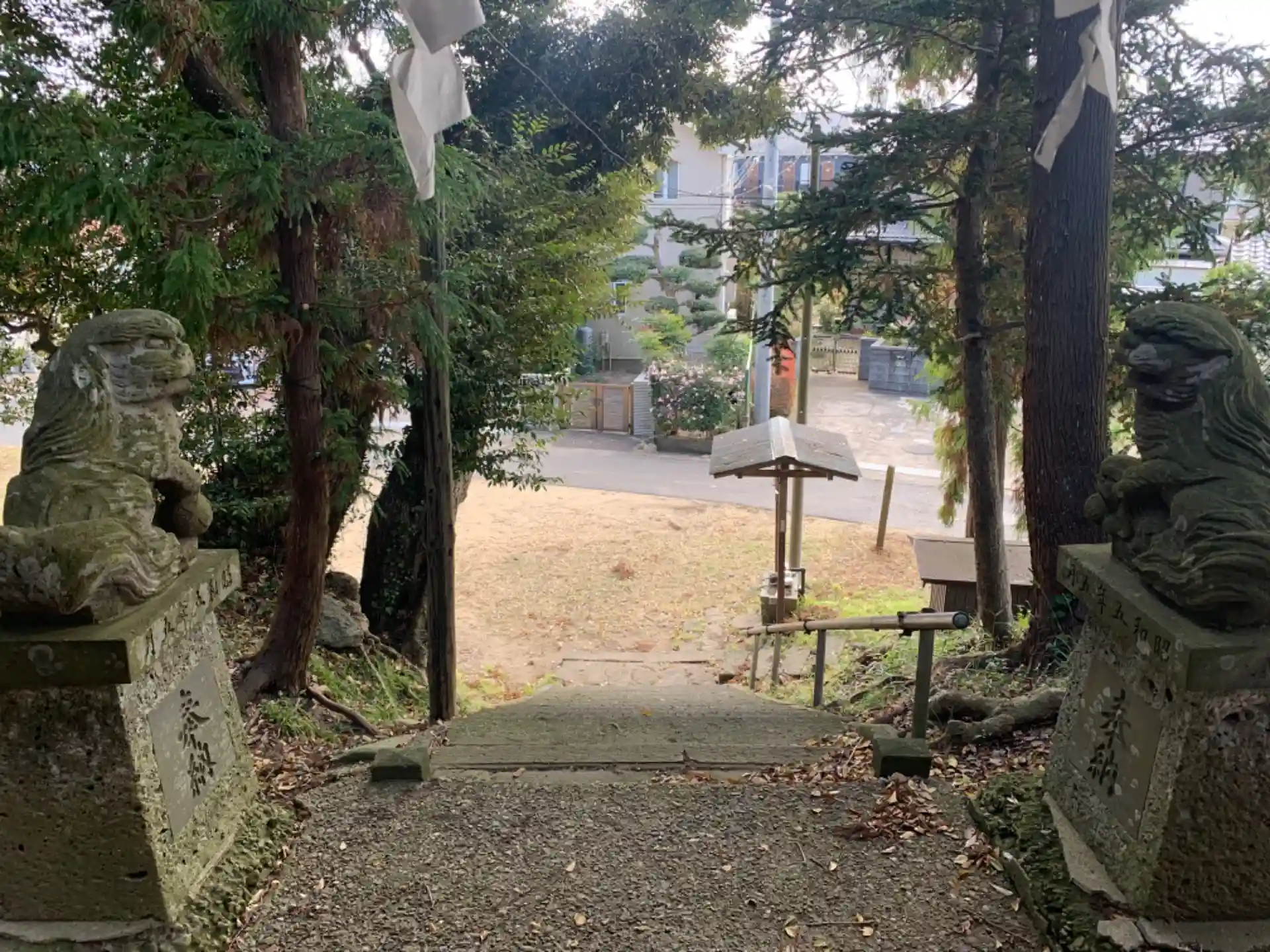 道路沿いの小高い丘にある神社。狛犬に独特のかわいさがあります。