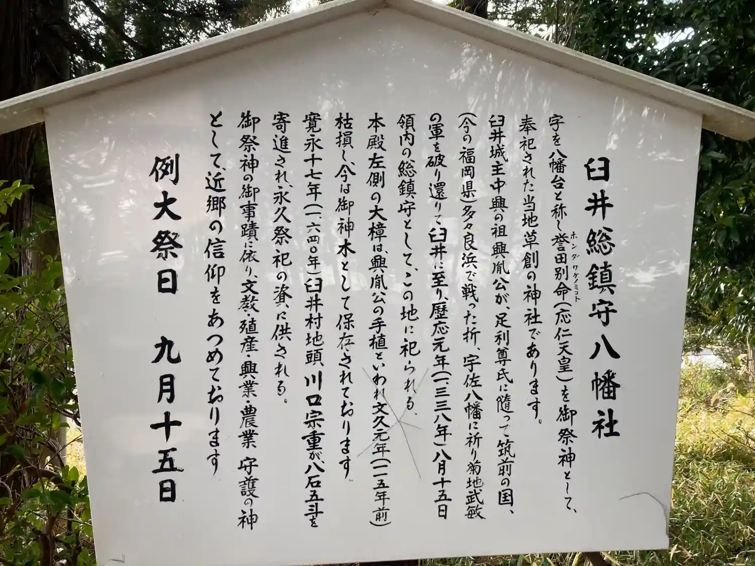 足利氏家臣の臼井氏が領内の総鎮守として建てたとされる神社。今でこそ住宅地の中に残された自然といった…