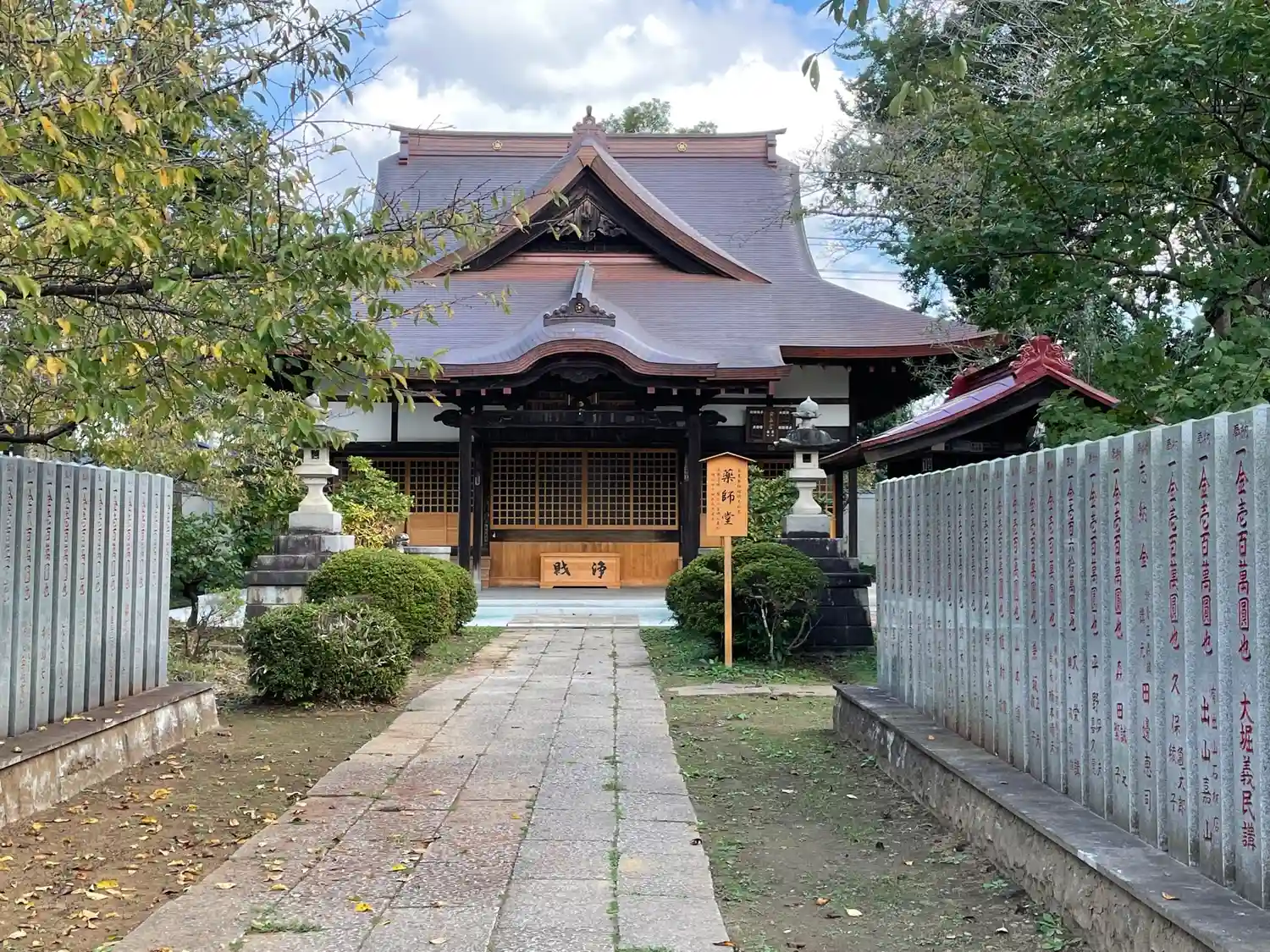 薬師堂正面と扁額。