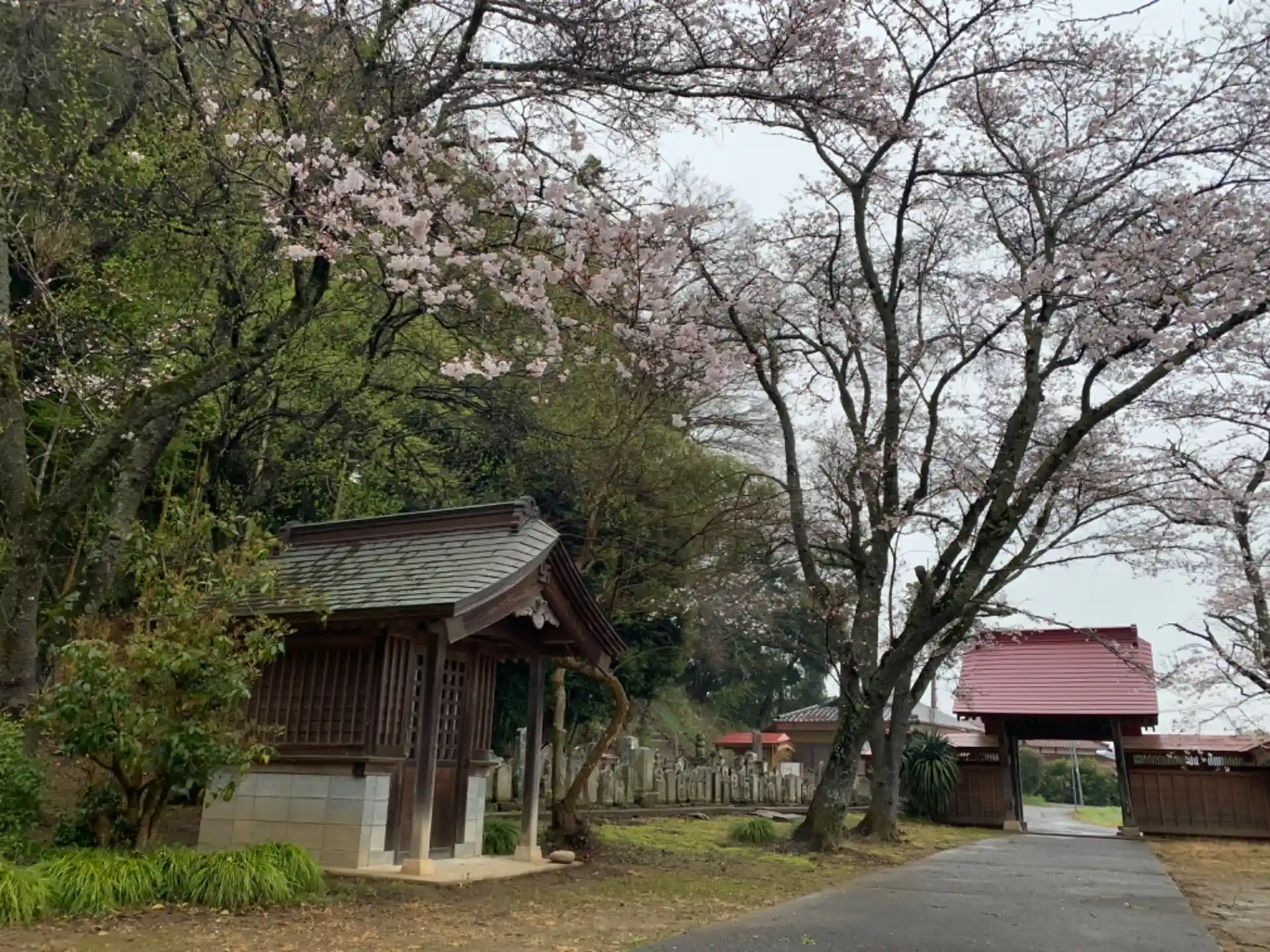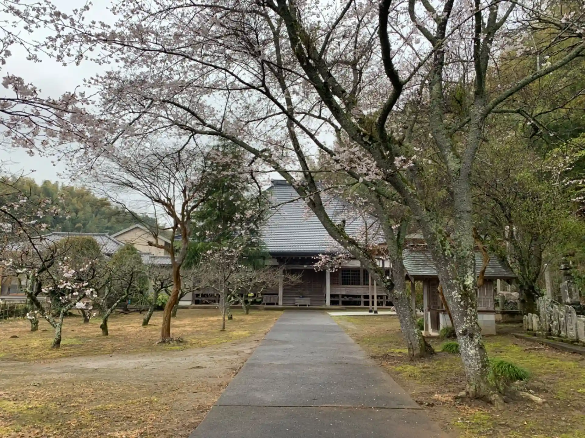 丘陵に囲まれたお寺。本堂には大きな龍が飾られています。敷地の奥から繋がれていない犬が鳴きながら近づいてきてかなり危険なので、山門のあたりから拝むのがいいかもしれません。
