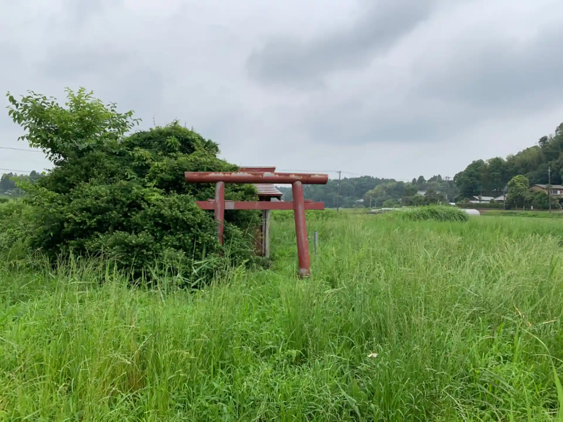田んぼの中に浮かぶ小島のような祠。正しい道を選ばないと用水路に阻まれて到達できません。ここから北側にある赤い屋根の民家脇の農道から入り、細い畦道を渡るとたどり着くことができます。