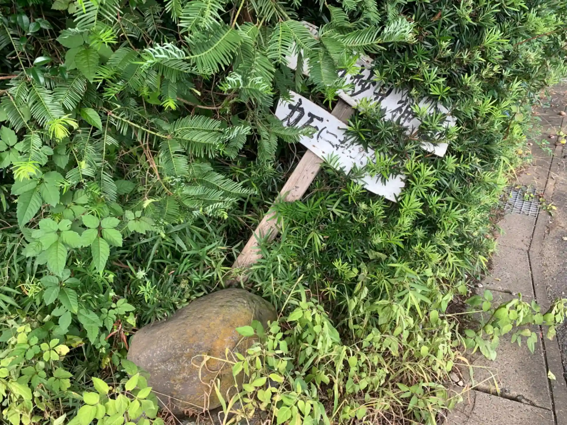 集会所の裏にひっそり建つ神社。入口には看板と力石があります。