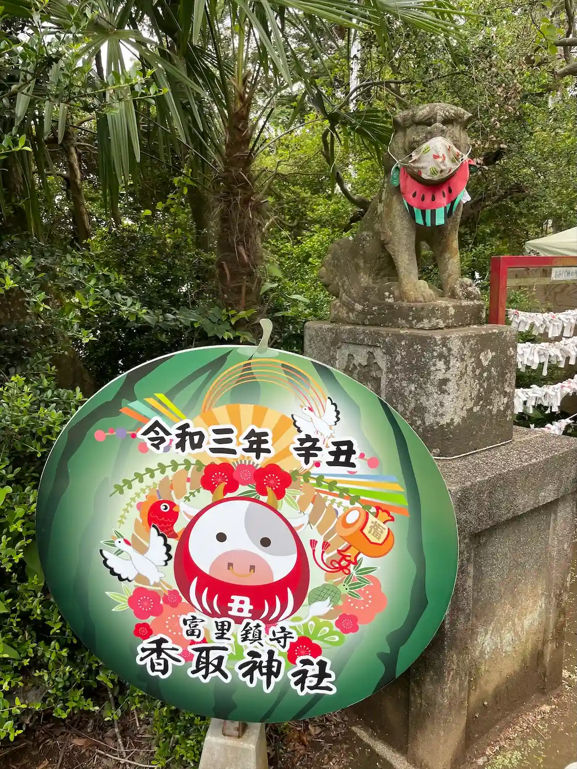 狛犬さん。スイカのマスクをしています。可愛い( *´艸`)