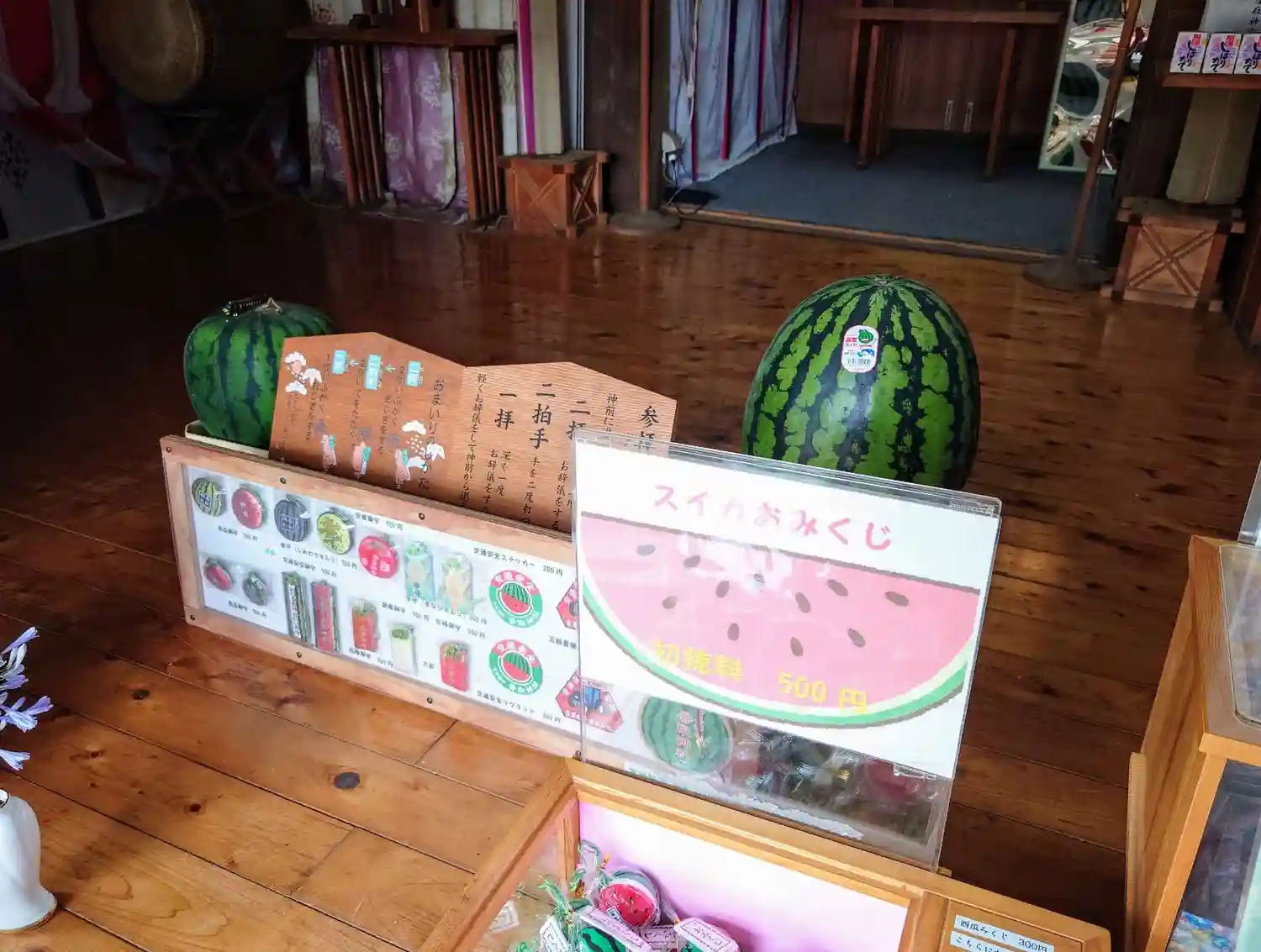 スイカの町の神社。四角いスイカがお供えされてる。