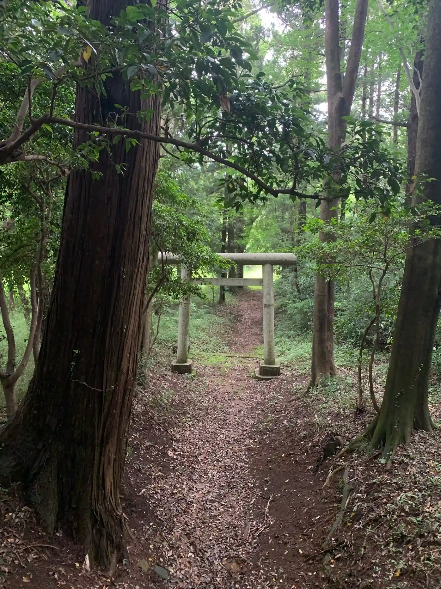 未舗装の道路を森の方へ進んでいくとY字路があり、左折するとすぐに鳥居が見えます。参道には道祖神と思われる石造物が木の根元に集められていました。