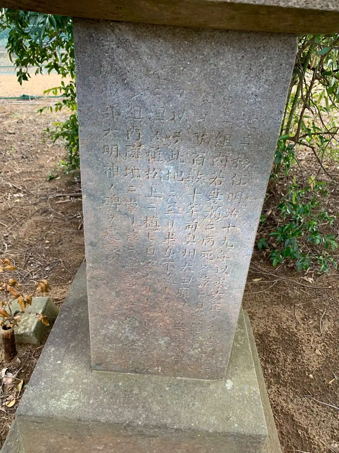 ソーラーパネルが敷かれた空き地の脇に残る古墓のような石造物。木に隠れていて発見するのが難しいです。石の側面には大正14年創建当時に文字が刻まれていますが、富里市ホームページにまとまってる情報の方が普通に読みやすいです。