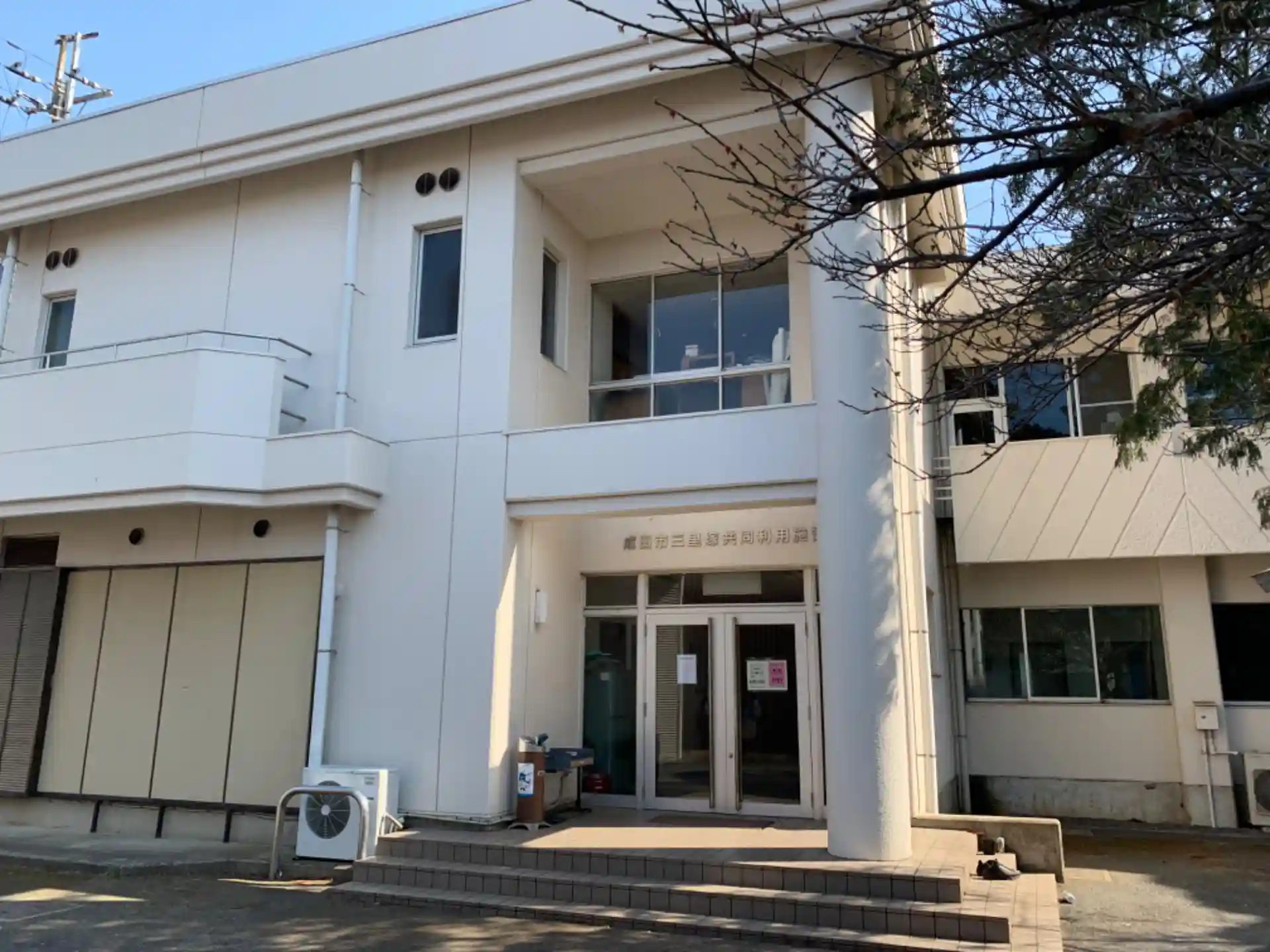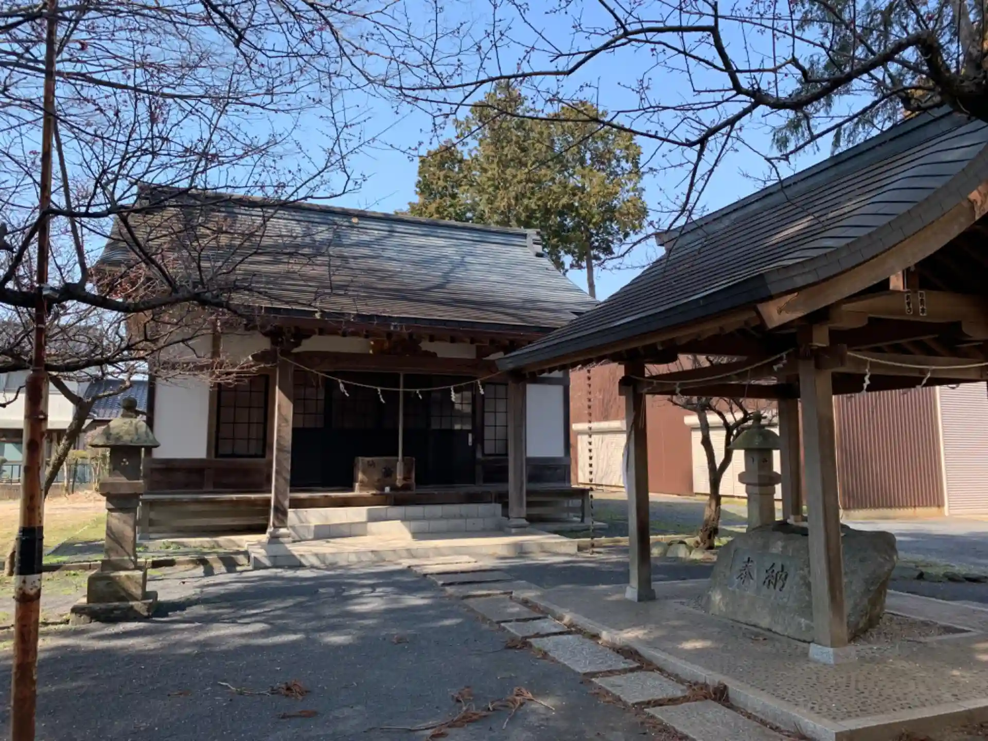 大通りの隣の通りにある神社。二階建ての大きな集会所がありました。