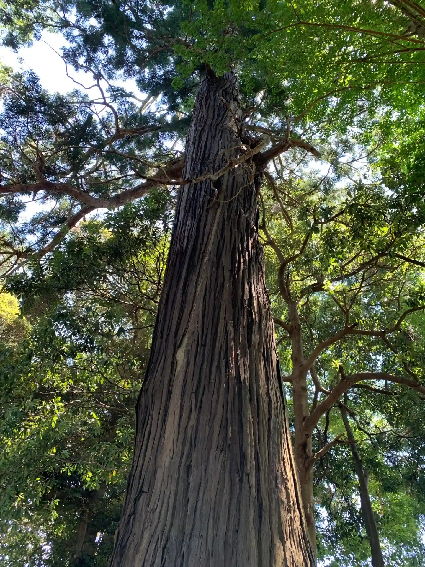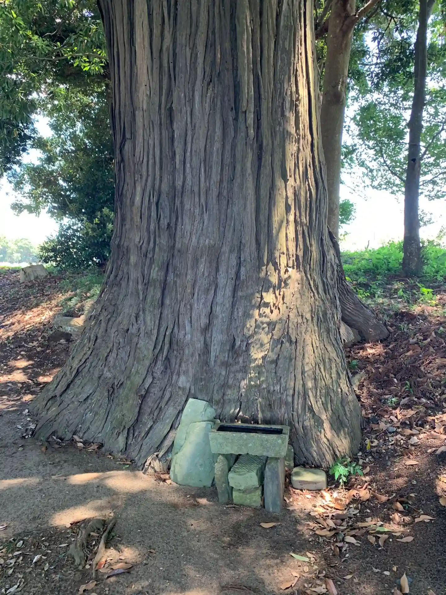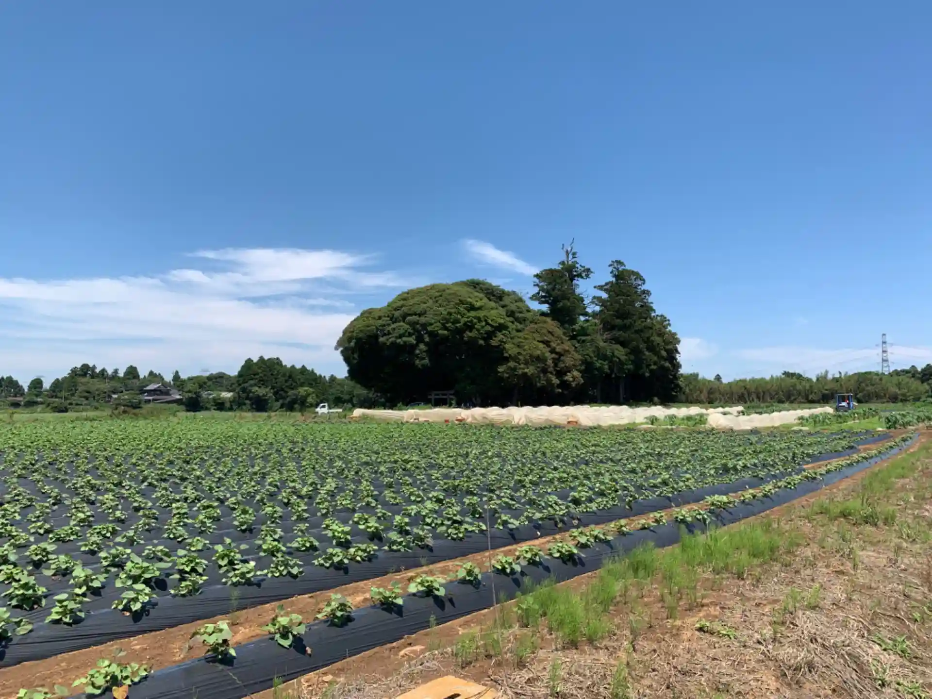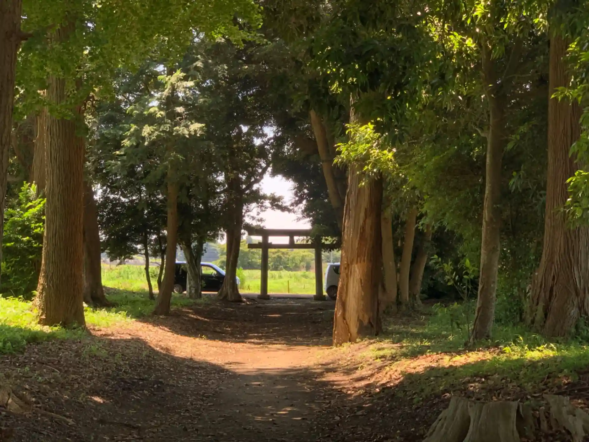 畑の真ん中に浮かぶ神社。境内に杉の巨木があります。