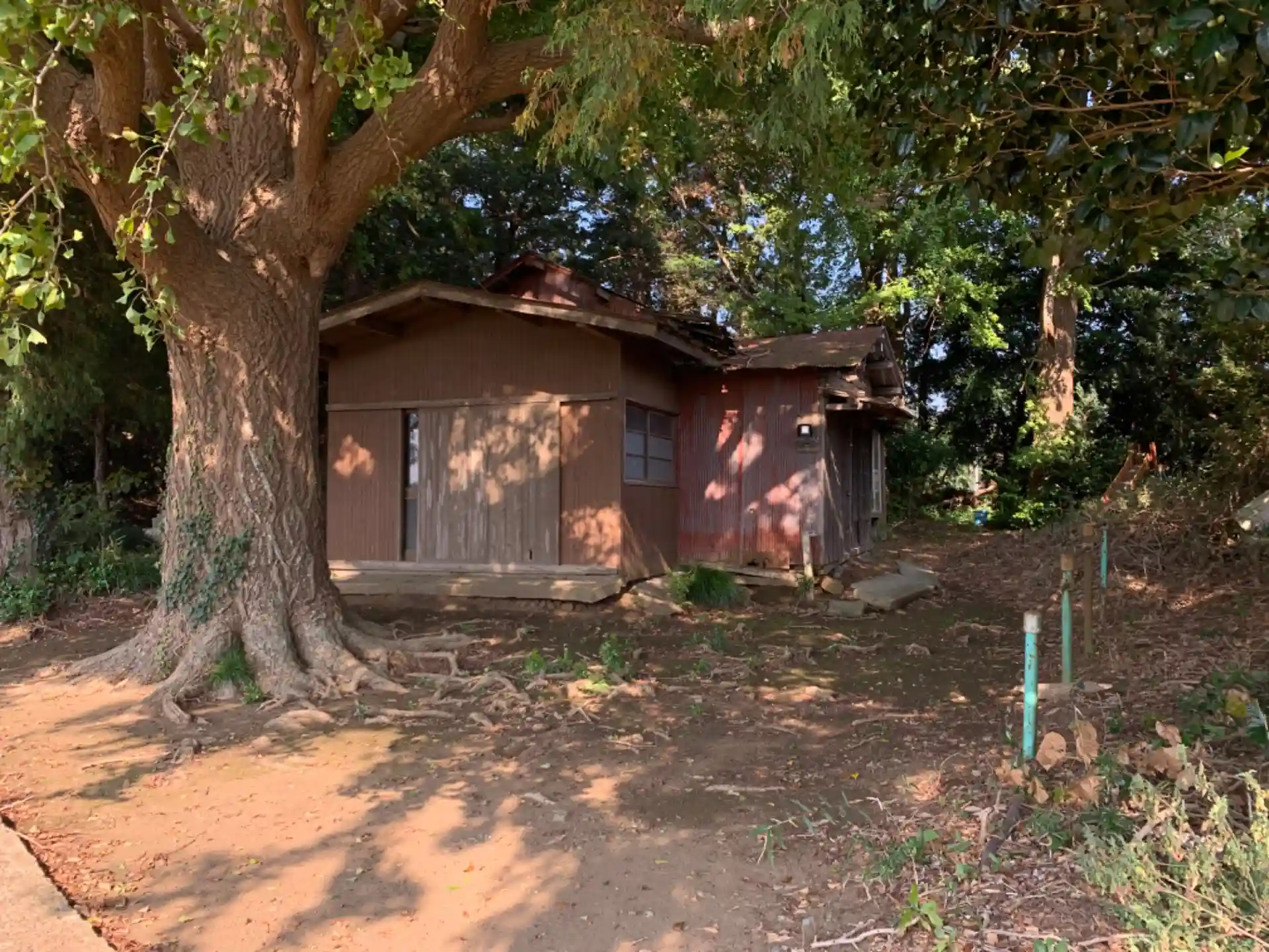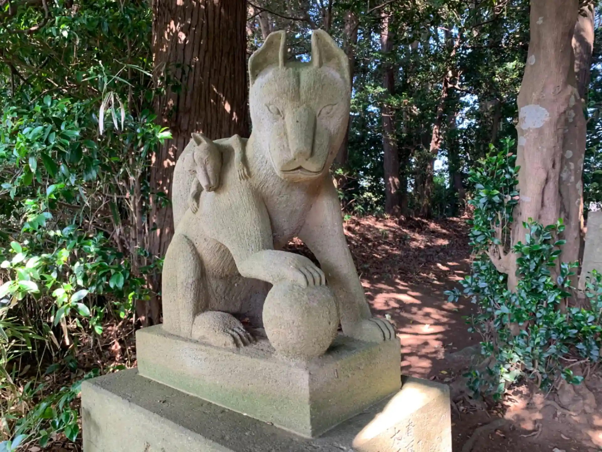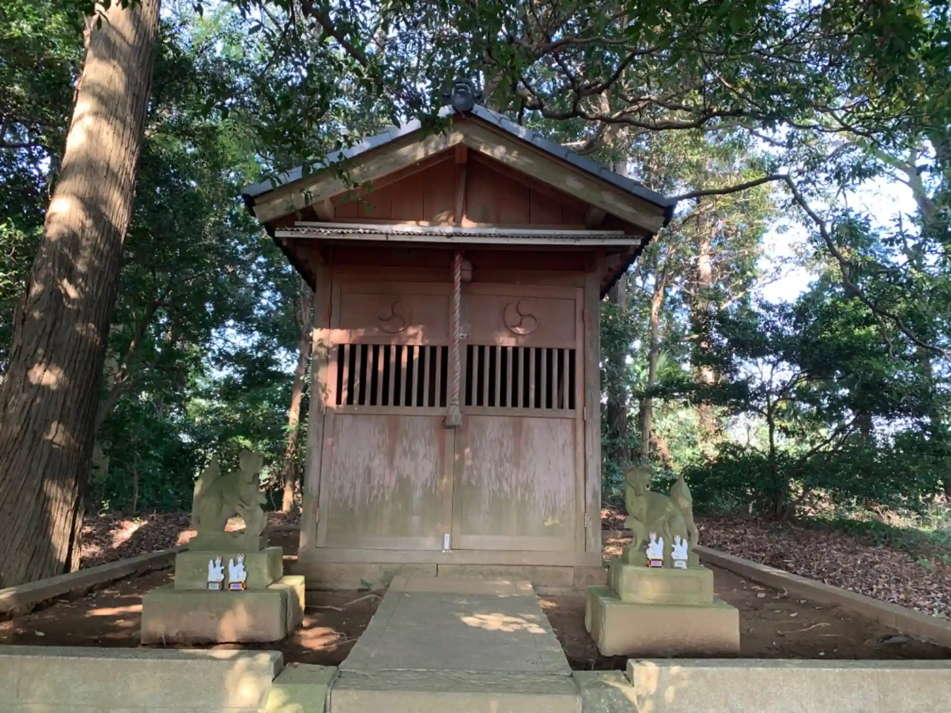 360度さつまいも畑に囲まれた小さな森の中に神社があります。かつて集会所だったと思われる廃墟が併設されていました。狐像の造形が独特でした。