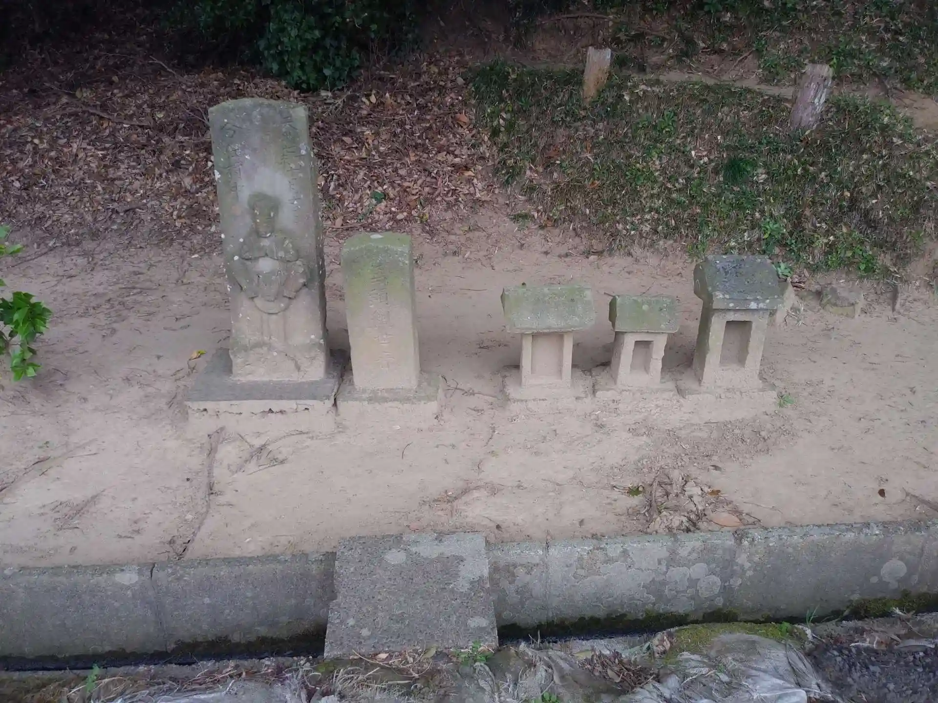 神社から少し離れた道路沿いには小さな祠や石塔が並んだ一画があります。
