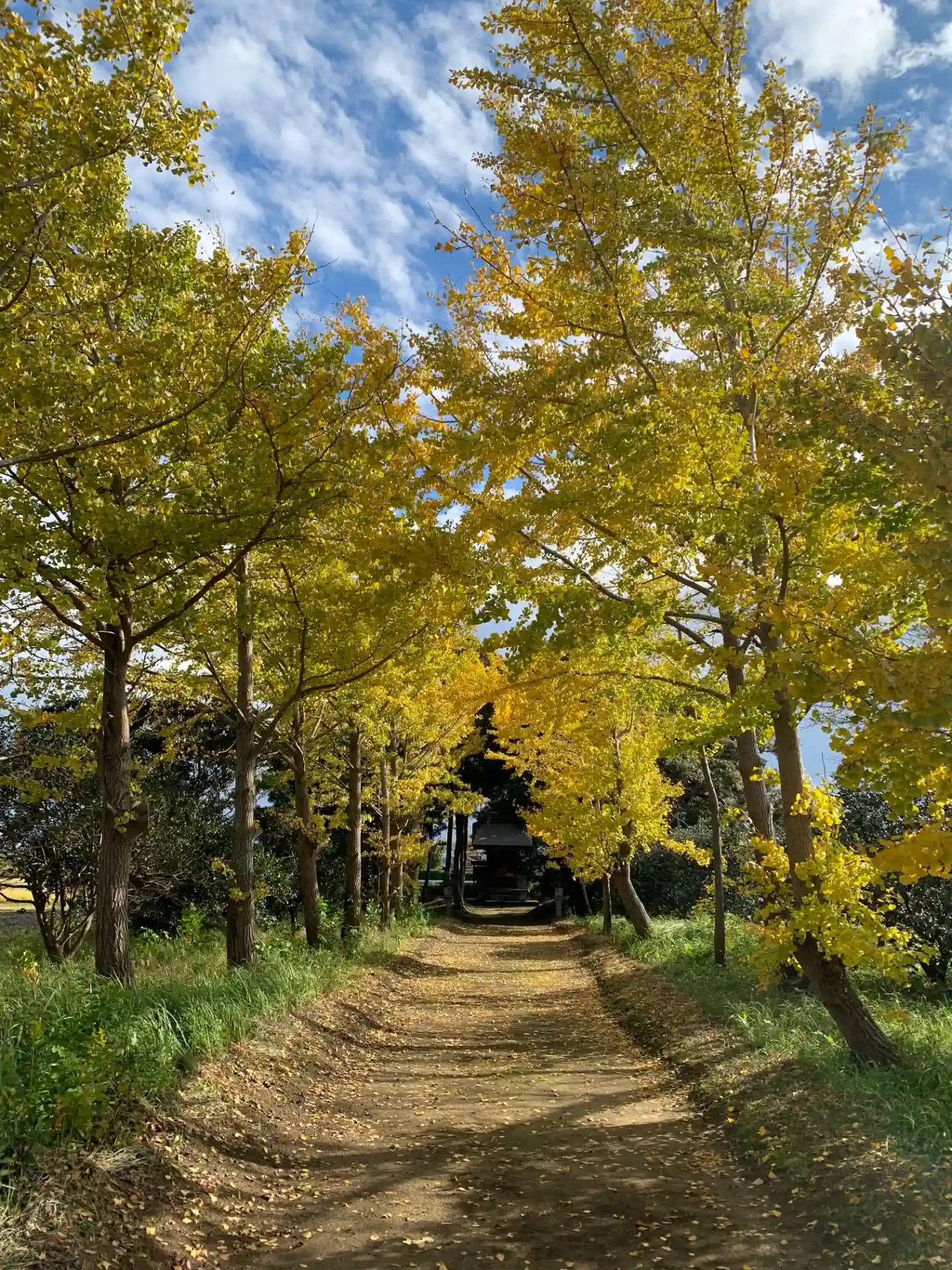 収穫後と田んぼが耕される前に行ったところ、銀杏並木と稲穂の黄色が鮮やかな素晴らしい景色に出会えました。