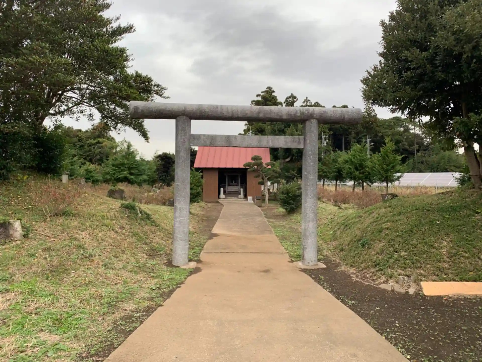 覆屋の中に茅葺のお社があり、狛犬みたいな感じで一対のアレが奉納されていました。