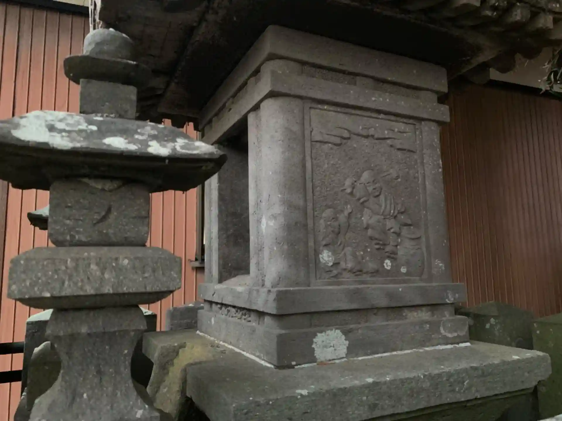 民家の隙間に祠があります。三面に人物彫刻があり工芸品として見るべきものがあるように思えます。