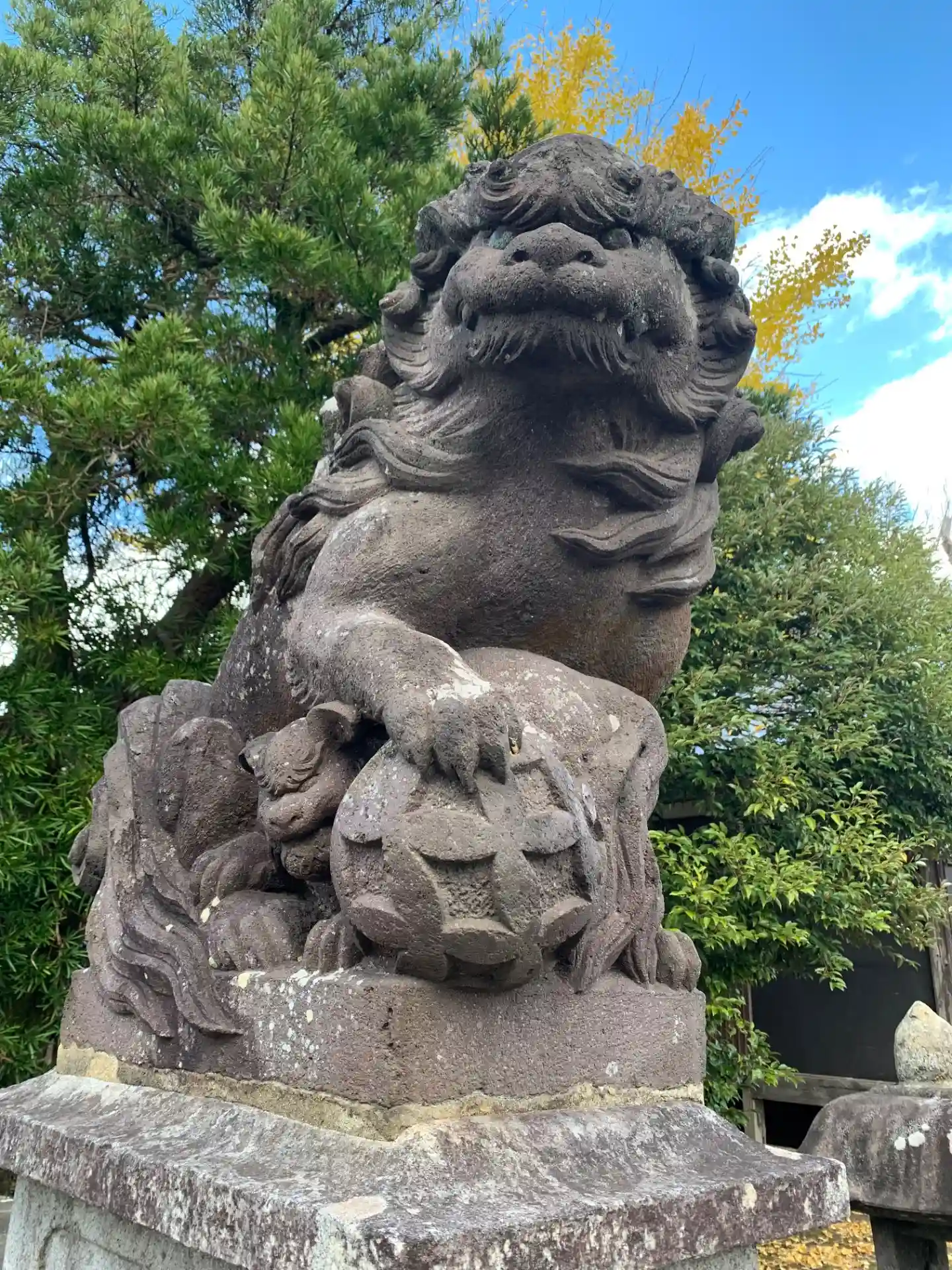 集会所の隣にある地域の中心的な神社。大きくて立派な狛犬が目を惹きます。
