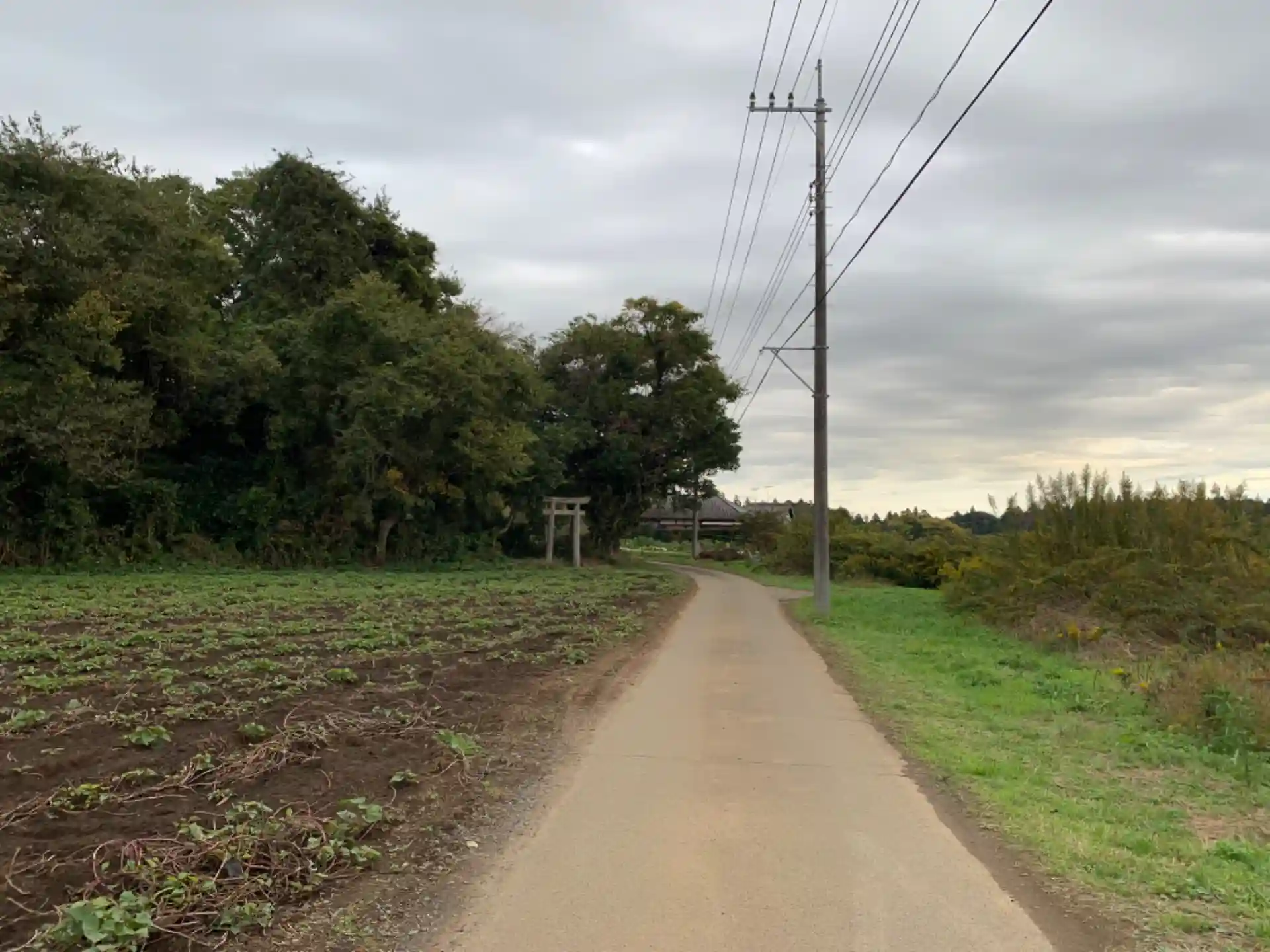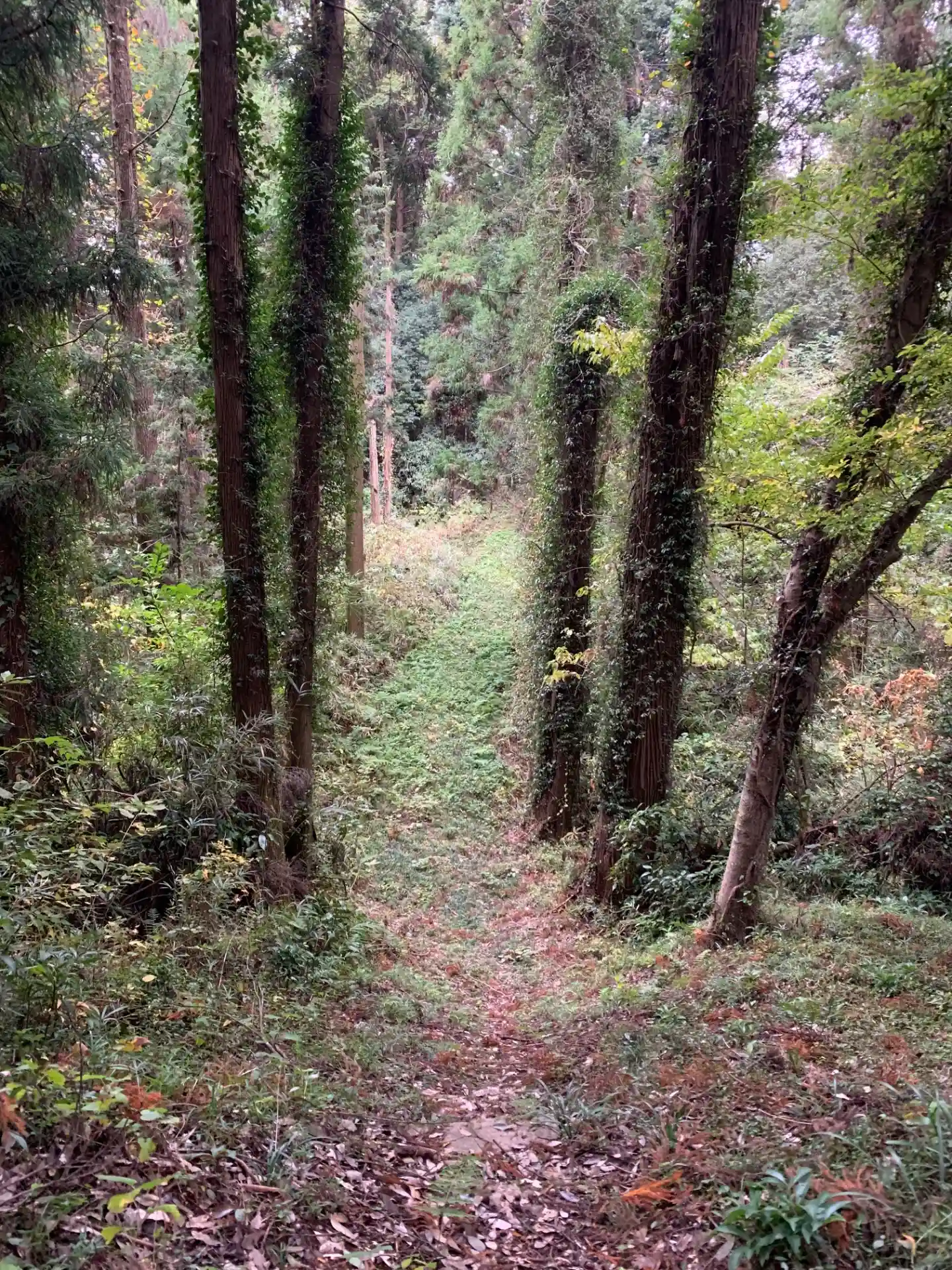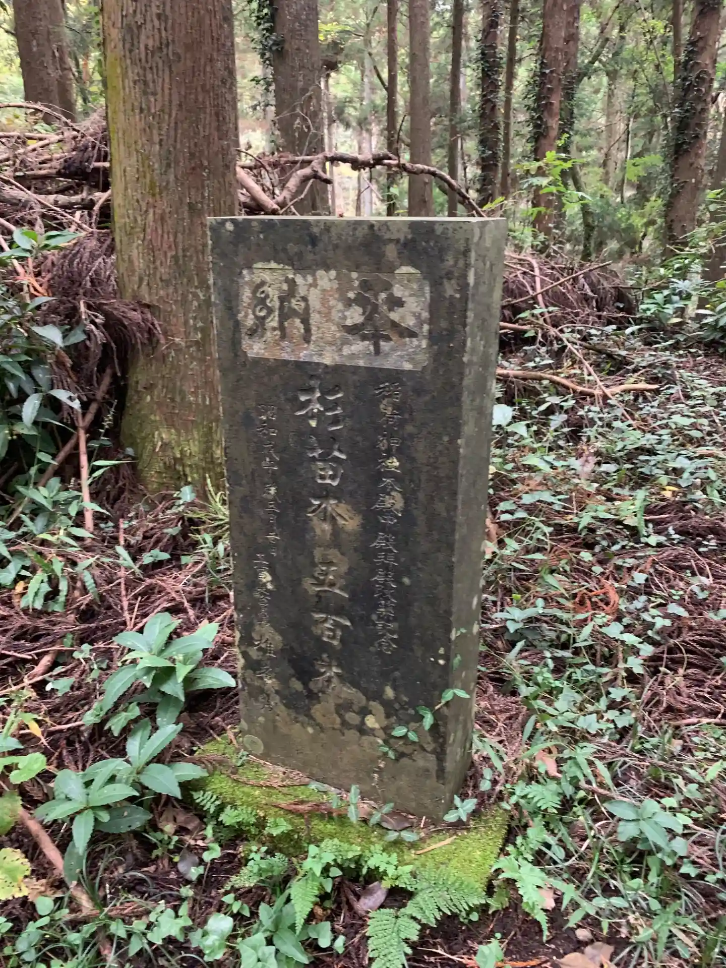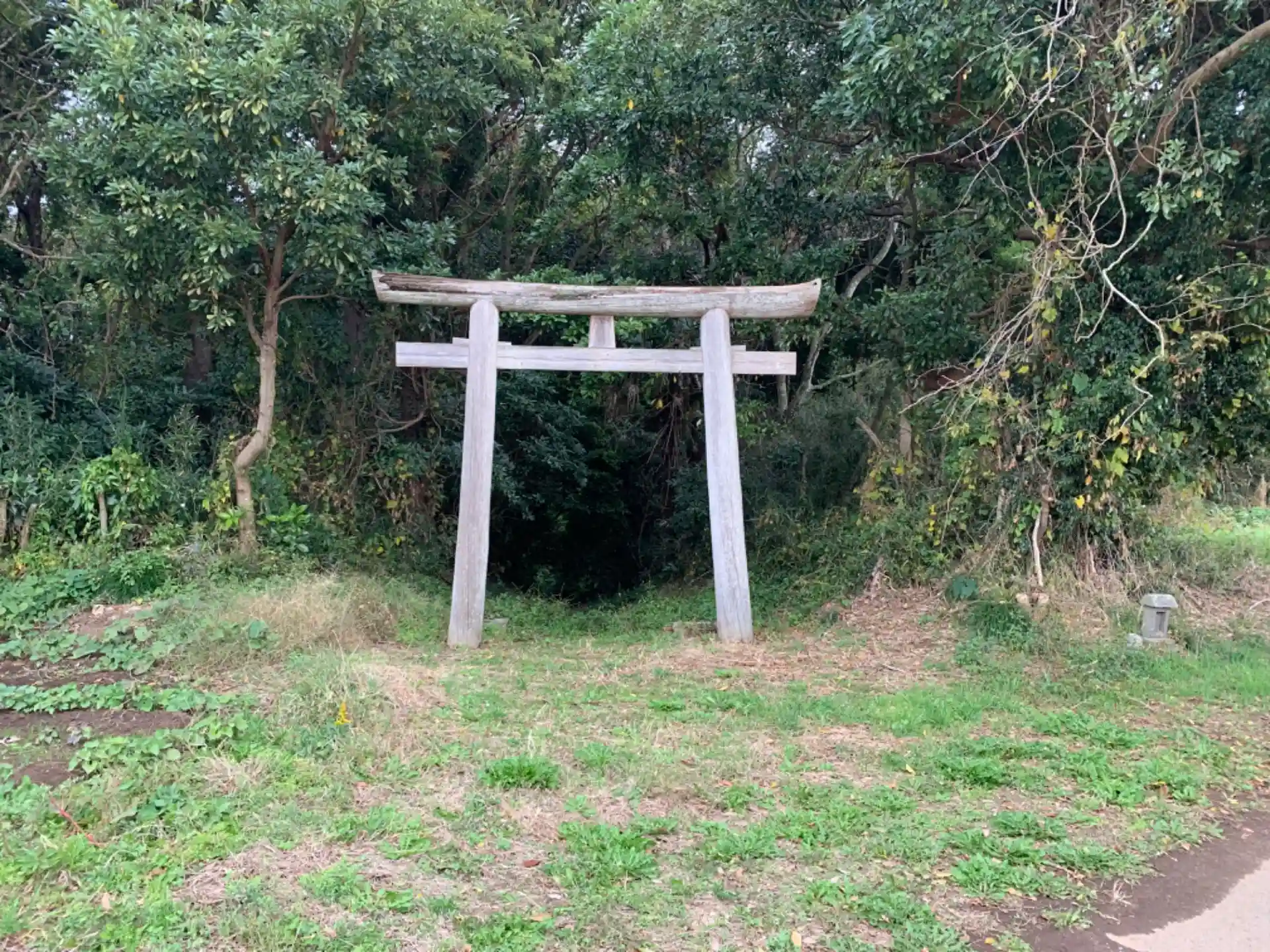畑地の片隅に鳥居があり、一度谷を下って登ったところに祠がある珍しい立地です。足場が悪く、日が当たるところは下草が多いです。祠の奥にはさらに何かありそうな道がありますが、シダに覆われていました。