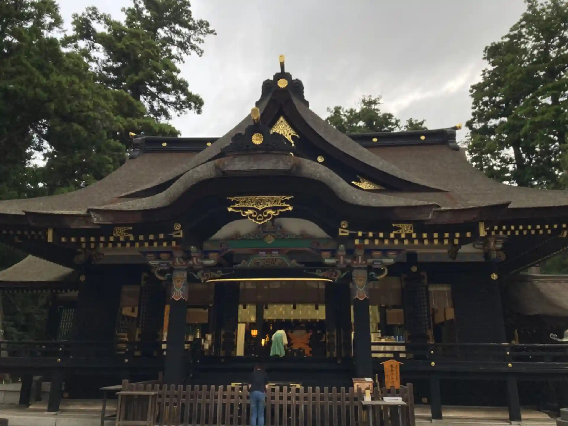 夕暮れで拝殿はより黒が深い。
