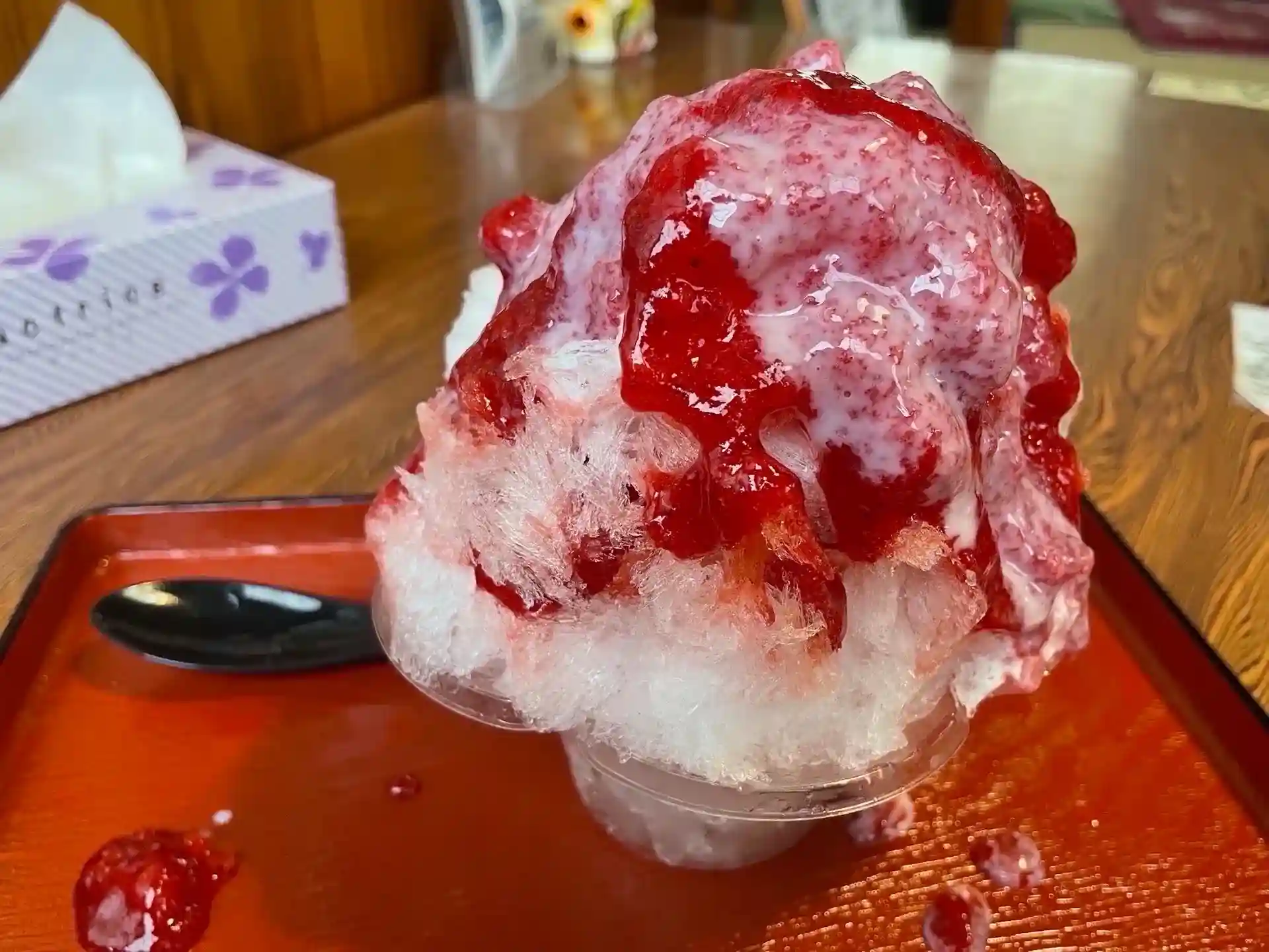 おじいさん店主が「努力と工夫を重ねに重ねてようやく逸品の境地にたどり着いた」という幻のイチゴシロップ…説明はそれくらいにして、解けないうちに食べさして〜〜っ😅
