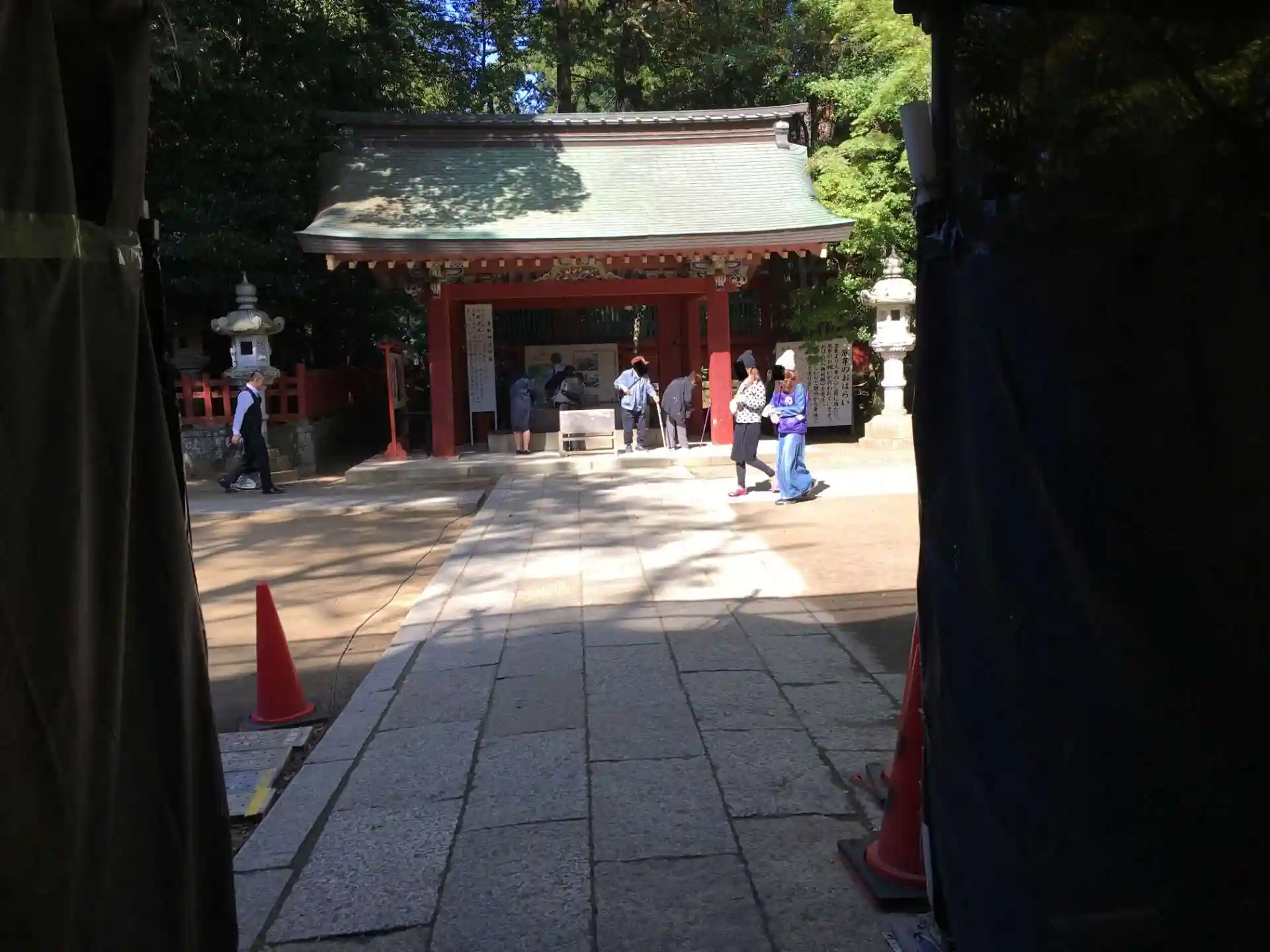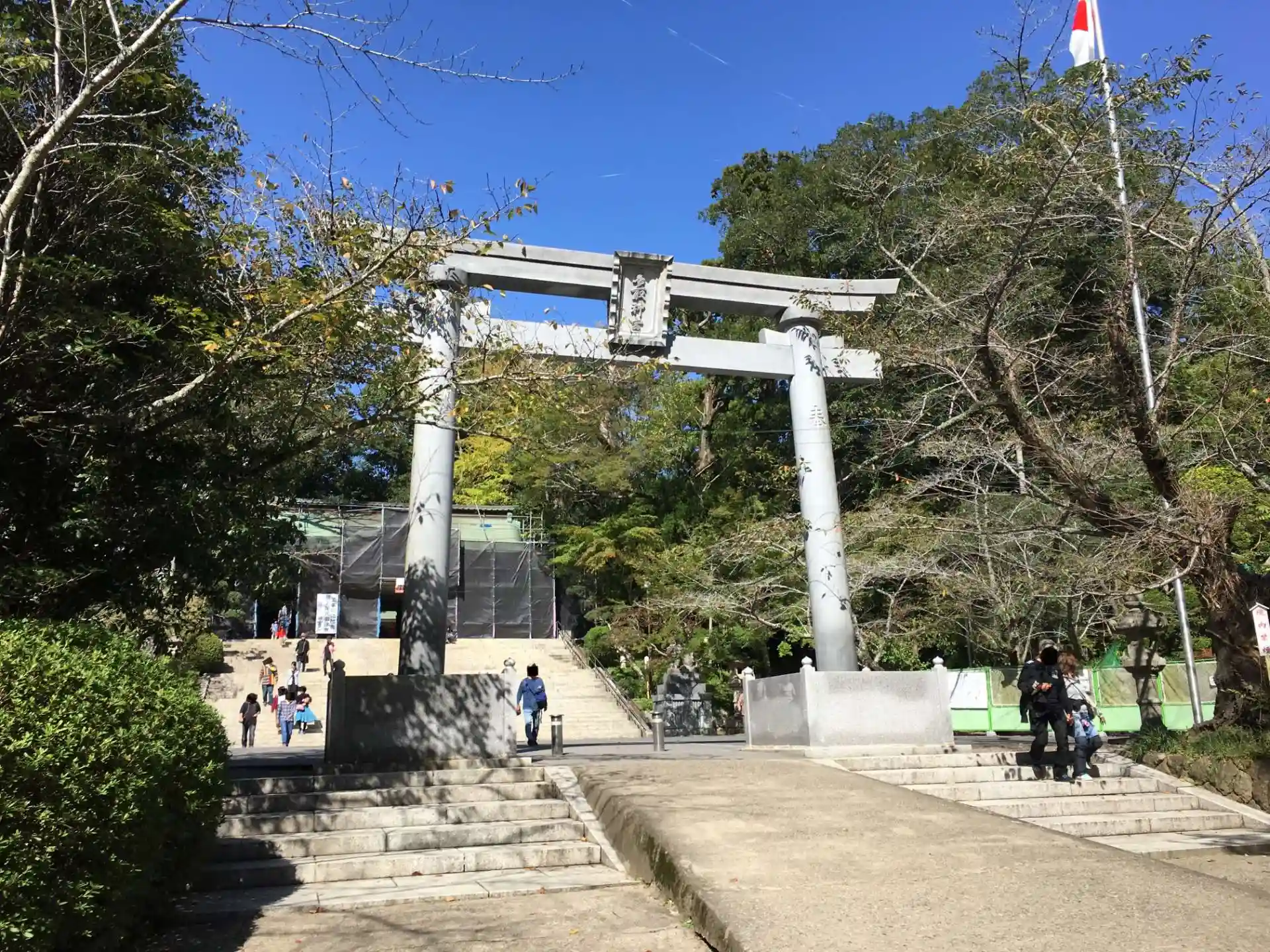 朱の大鳥居を抜け参道を進みます。灯篭には神の使いである鹿さんが。さらに進むと階段の上に...ん?改装中...調べてみるとそこには美しい門があるはずでした。