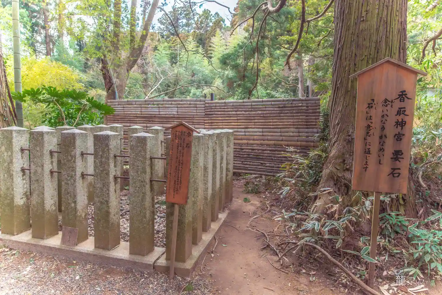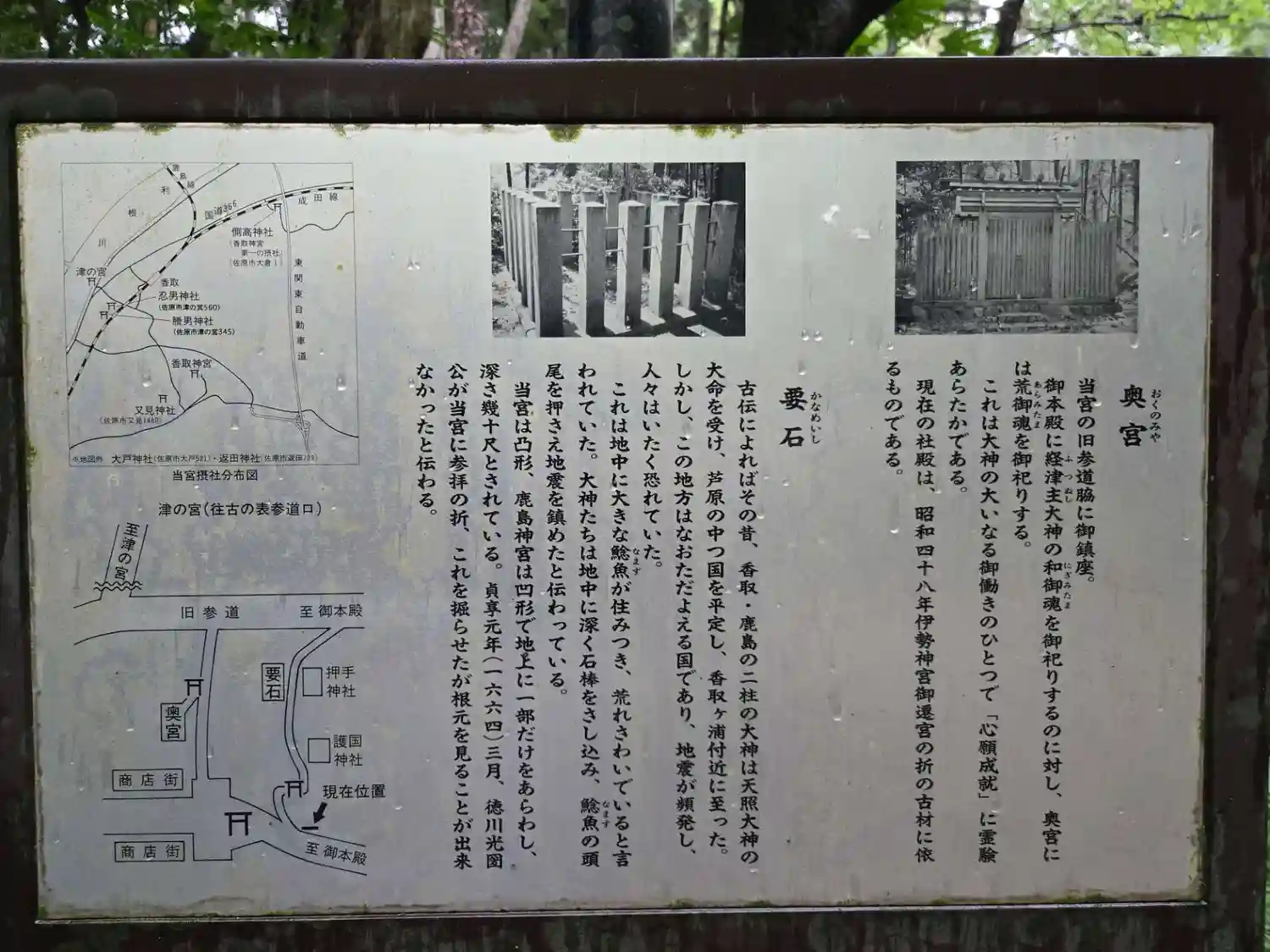 要石。地震を起こす大鯰を抑えるための石で香取神宮、鹿島神宮の両宮にある。香取は凸、鹿島は凹形。