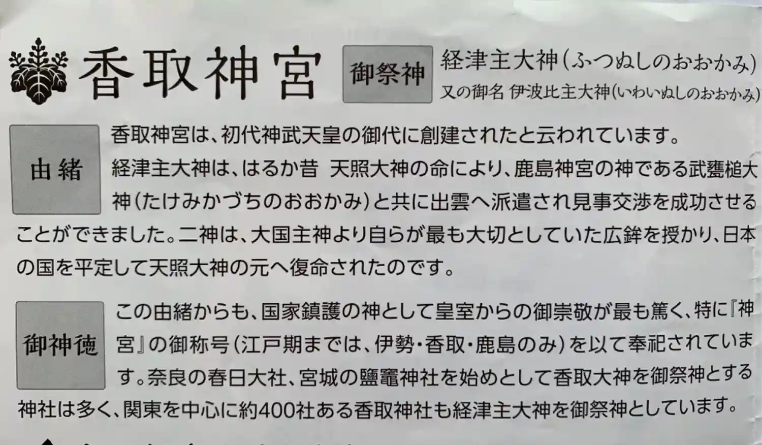 主祭神は、経津主大神(ふつぬしのおおかみ)。なかなか興味深い神様のようです。